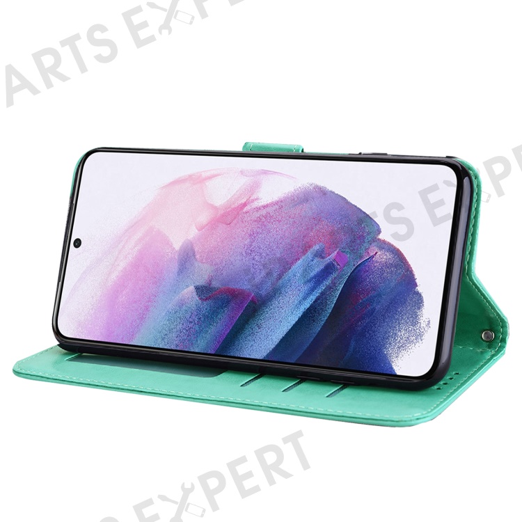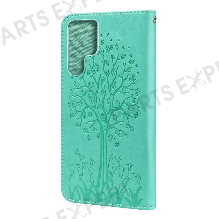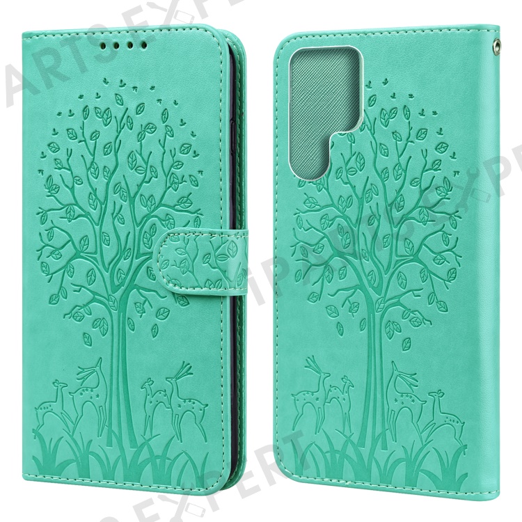Stand Function Deer and Tree Imprinted PU Leather Wallet Magnetic Shockproof Case for Samsung Galaxy S22 Ultra 5G - Green
