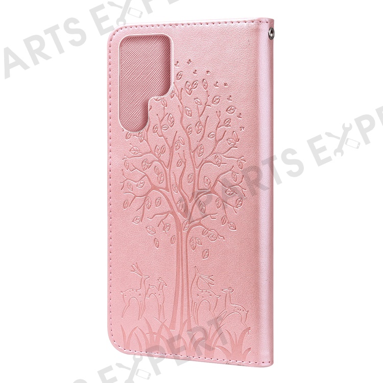 Stand Function Deer and Tree Imprinted PU Leather Wallet Magnetic Shockproof Case for Samsung Galaxy S22 Ultra 5G - Pink