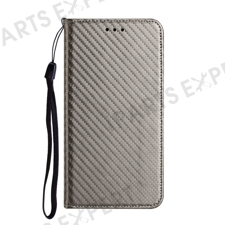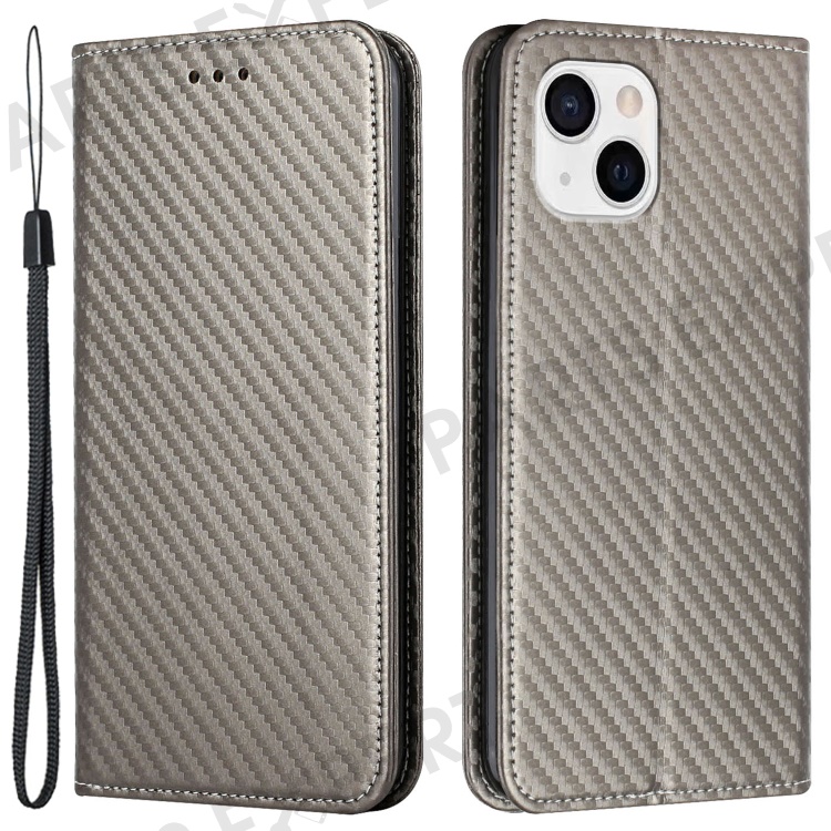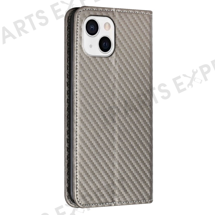 Stand Phone Cover for iPhone 15 Plus Carbon Fiber Texture PU Leather+TPU Wallet Case - Grey