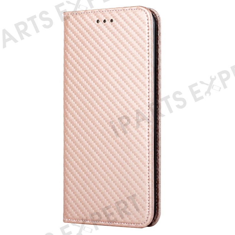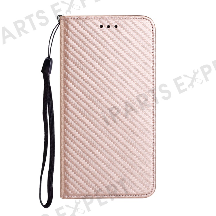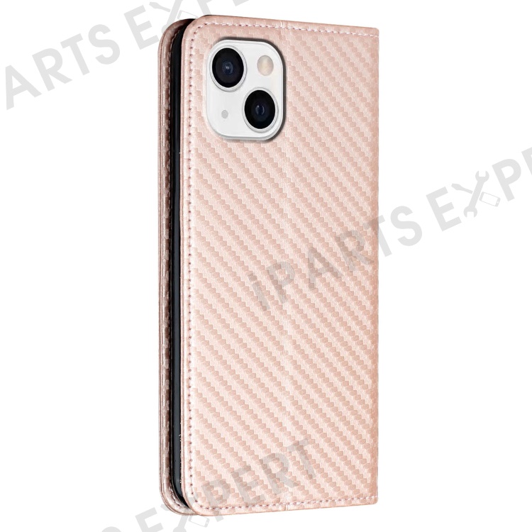 Stand Phone Cover for iPhone 15 Plus Carbon Fiber Texture PU Leather+TPU Wallet Case - Rose Gold