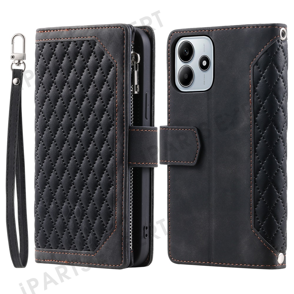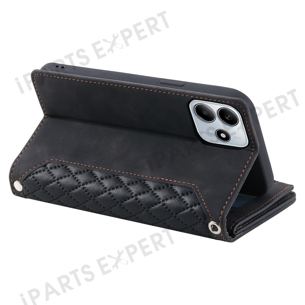 Style 005 For Xiaomi Redmi Note 14 5G Wallet Case Rhombus Stitching Line PU Leather Phone Cover - Black