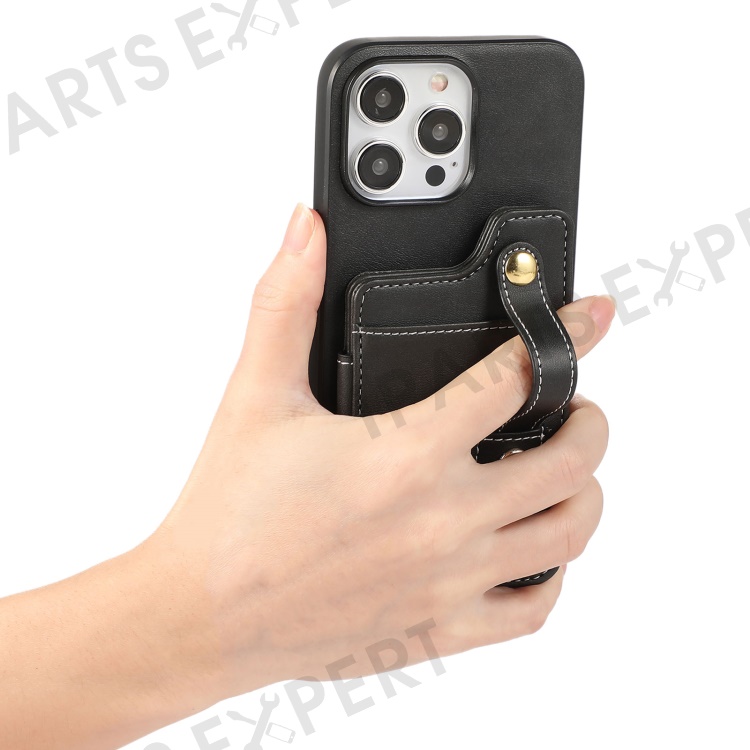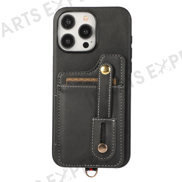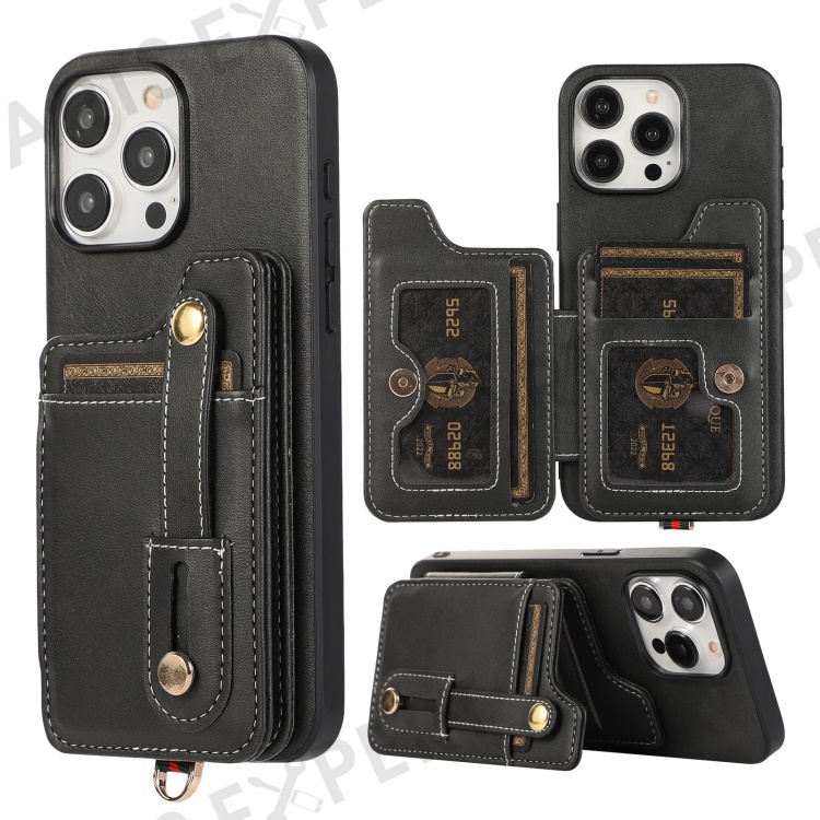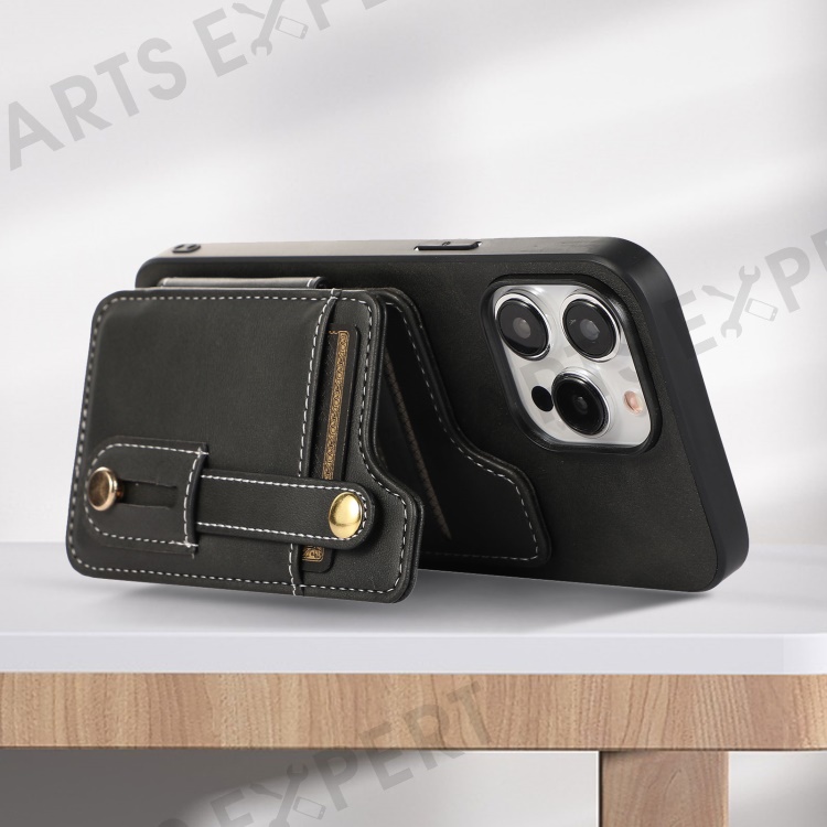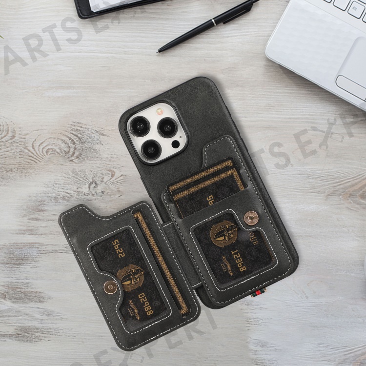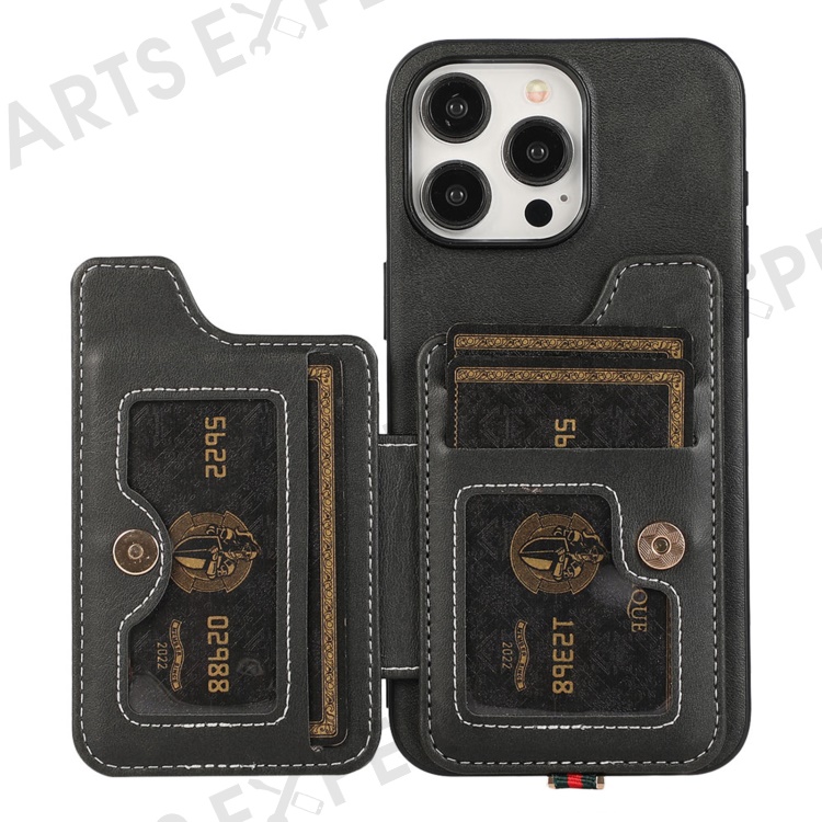 Style 01 For iPhone 14 Pro Case Card Holder Cowhide Texture PU Leather+TPU Phone Cover - Black