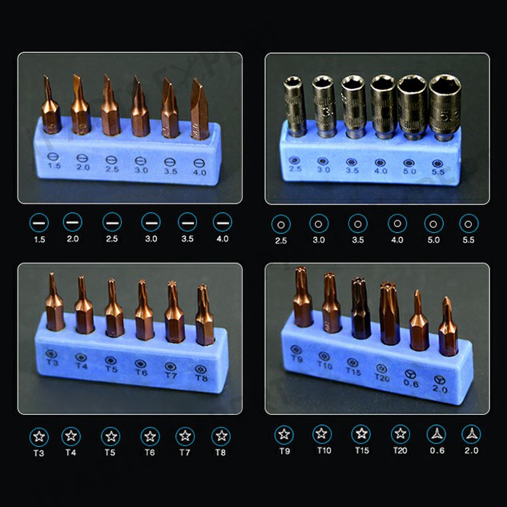 - 【Comprehensive Bit Collection】Includes Flathead, Phillips, Torx, Hex, Tri-wing, Pentalobe, and Square bits covering all common electronic device screws with sizes ranging from micro to standard.