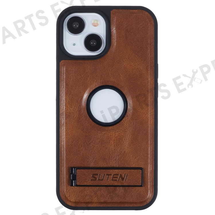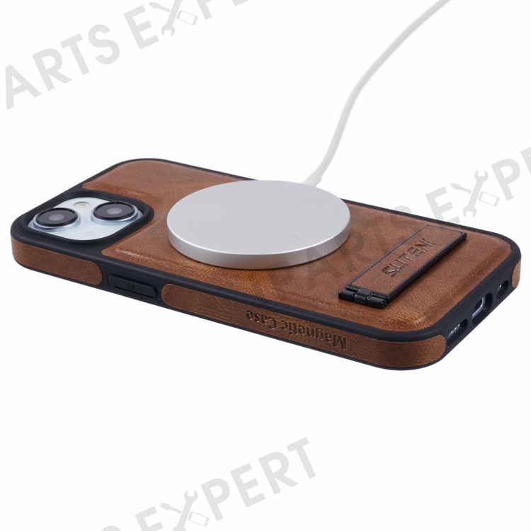 SUTENI G2 For iPhone 15 Magnetic Case Leather Phone Back Cover Waxy Texture Kickstand - Brown