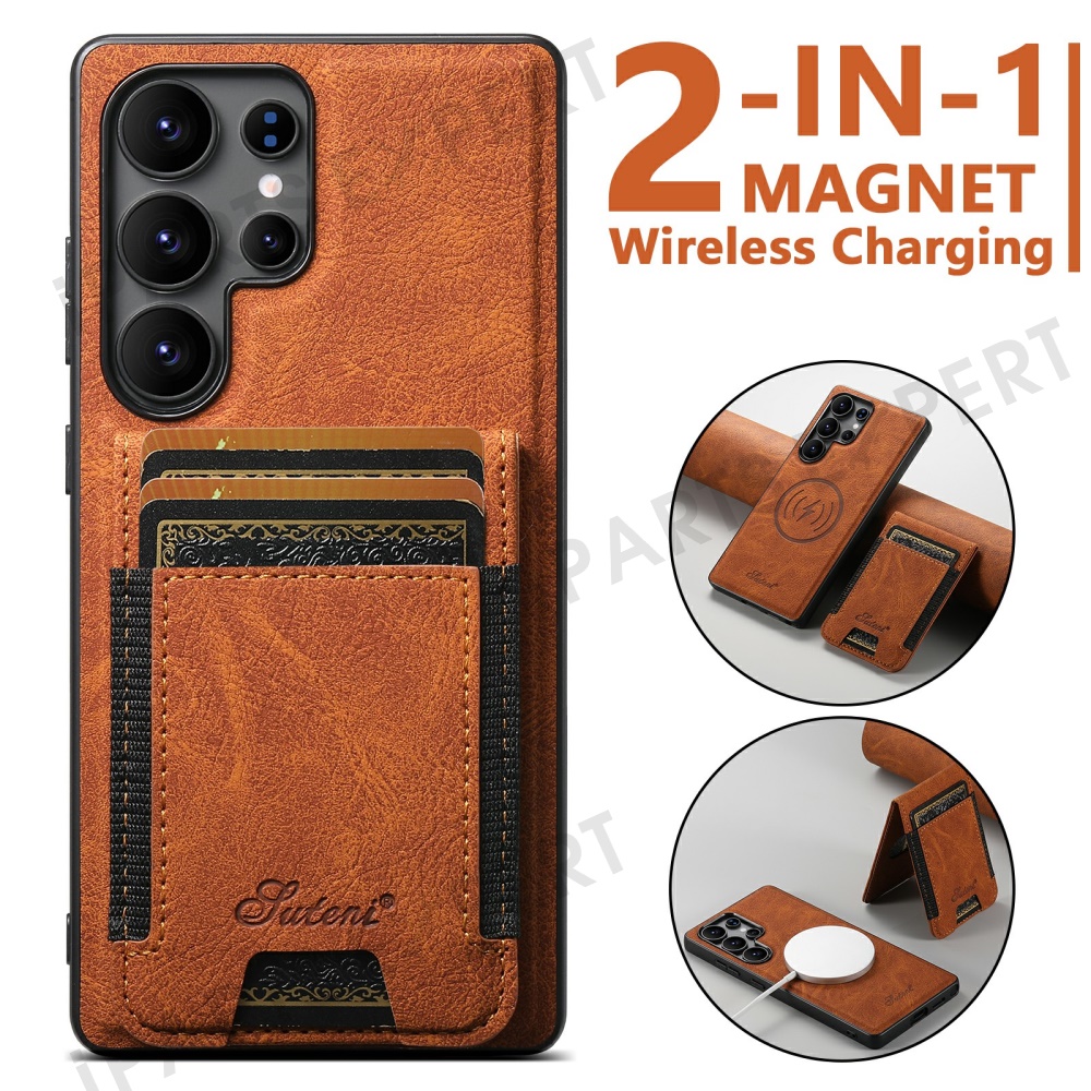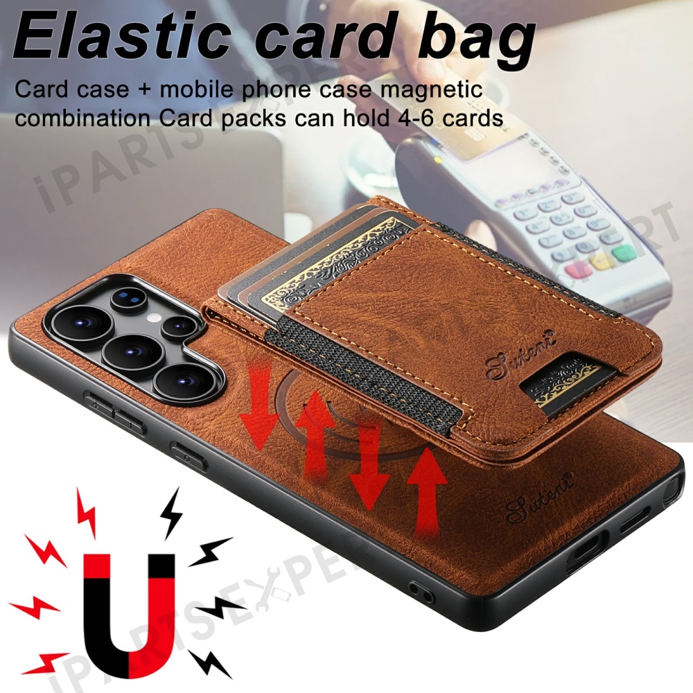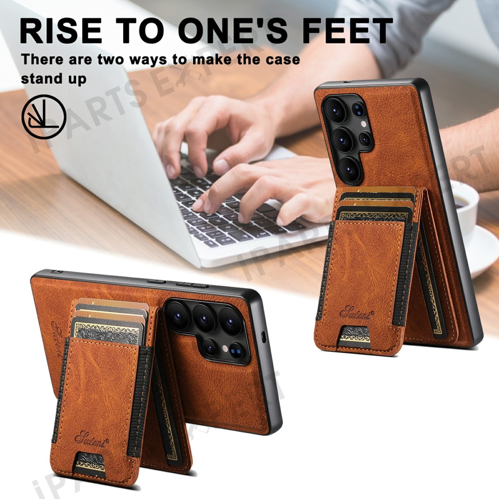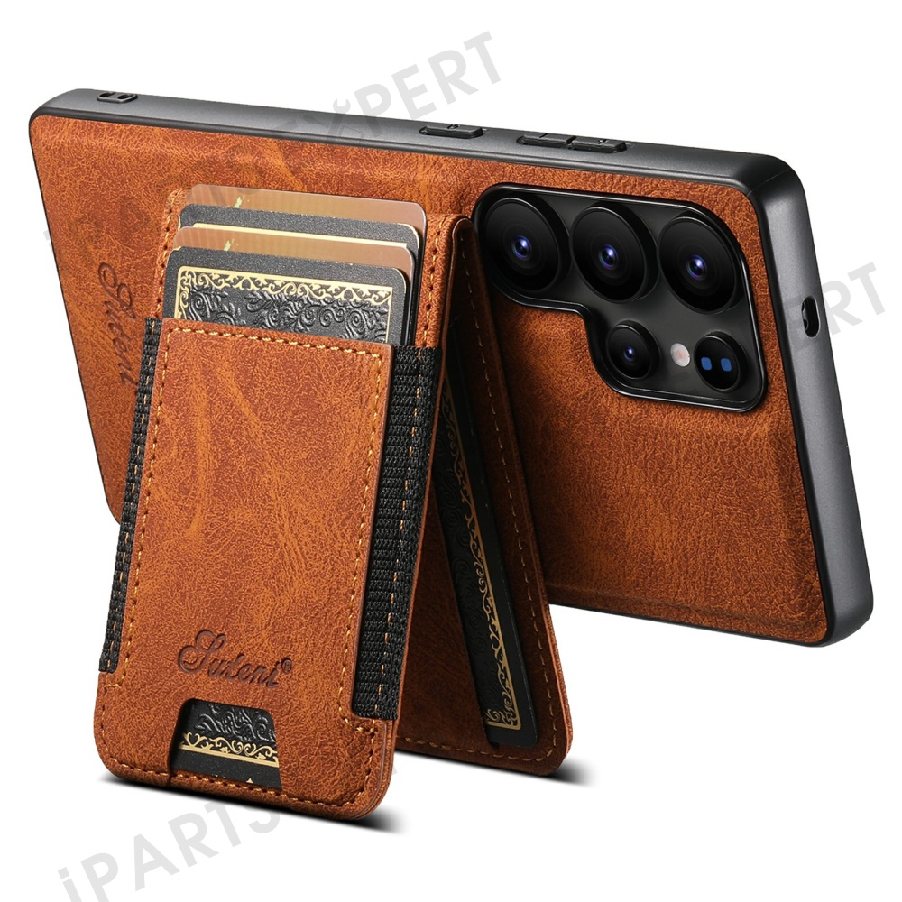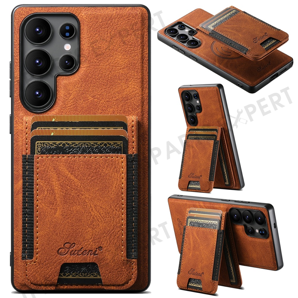SUTENI H17 For Samsung Galaxy S25 Ultra Magnetic Case Card Slots Leather + TPU Kickstand Phone Cover - Khaki