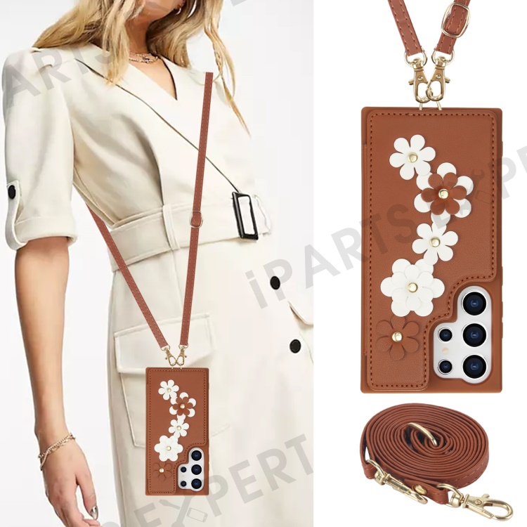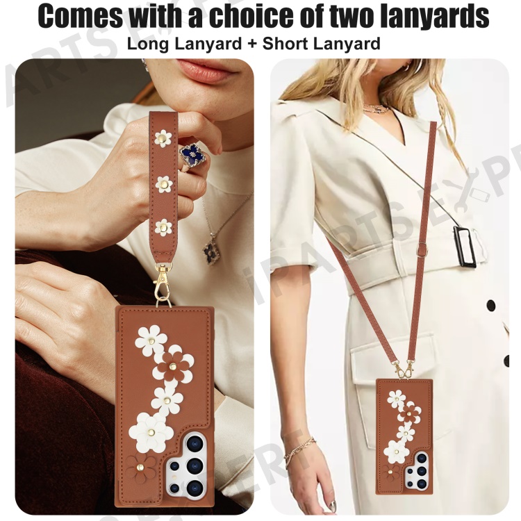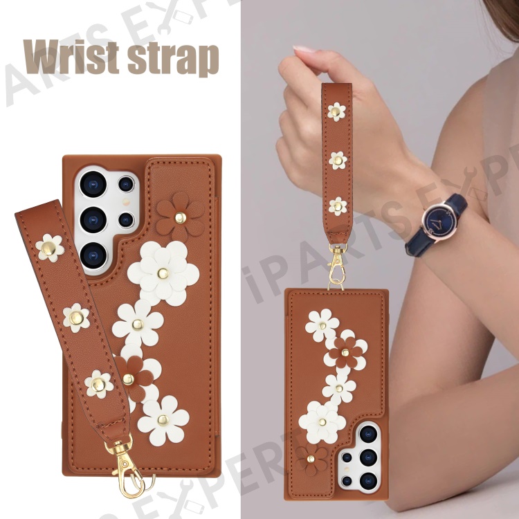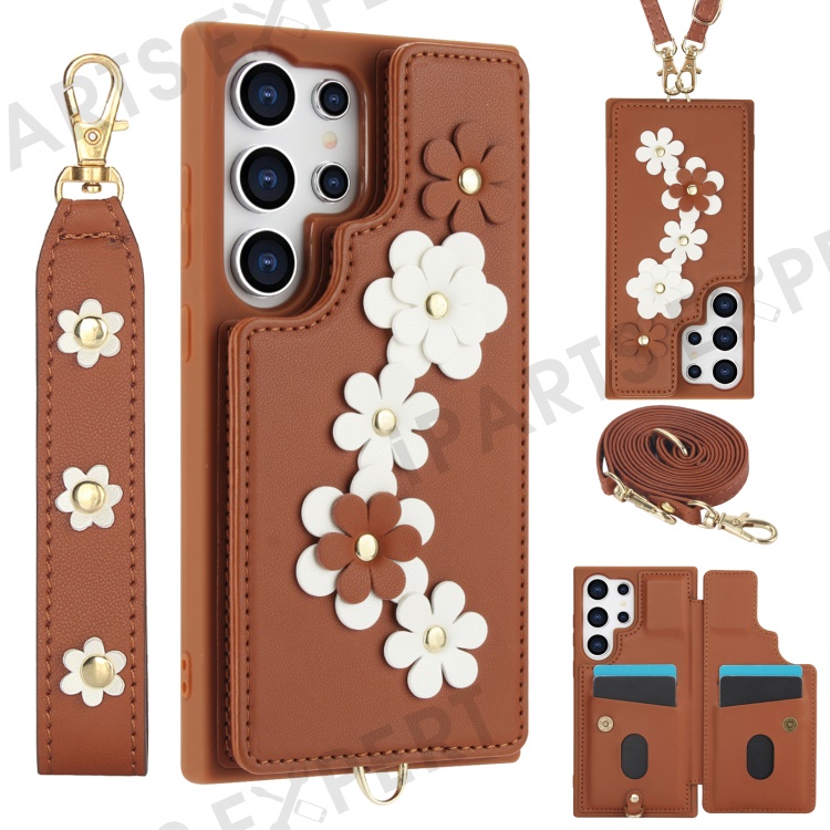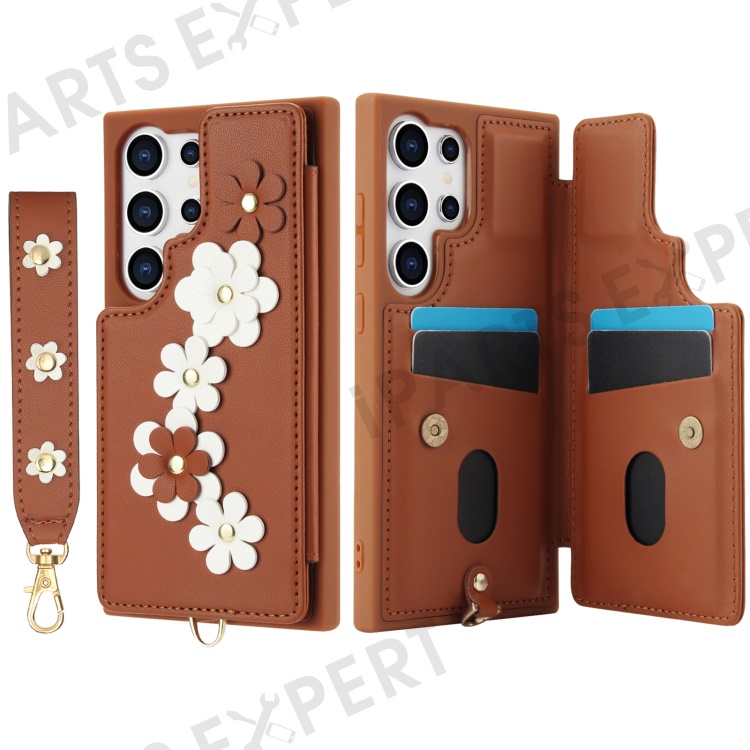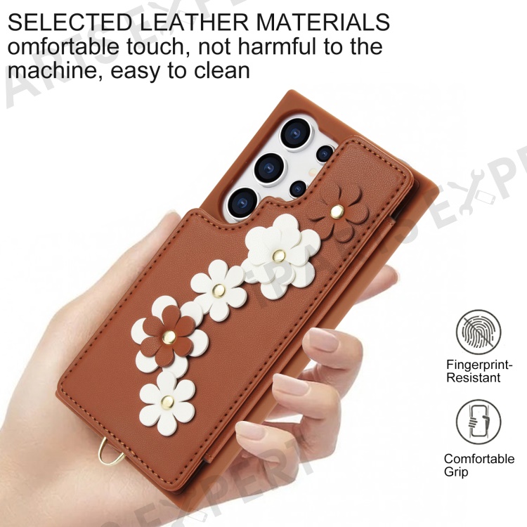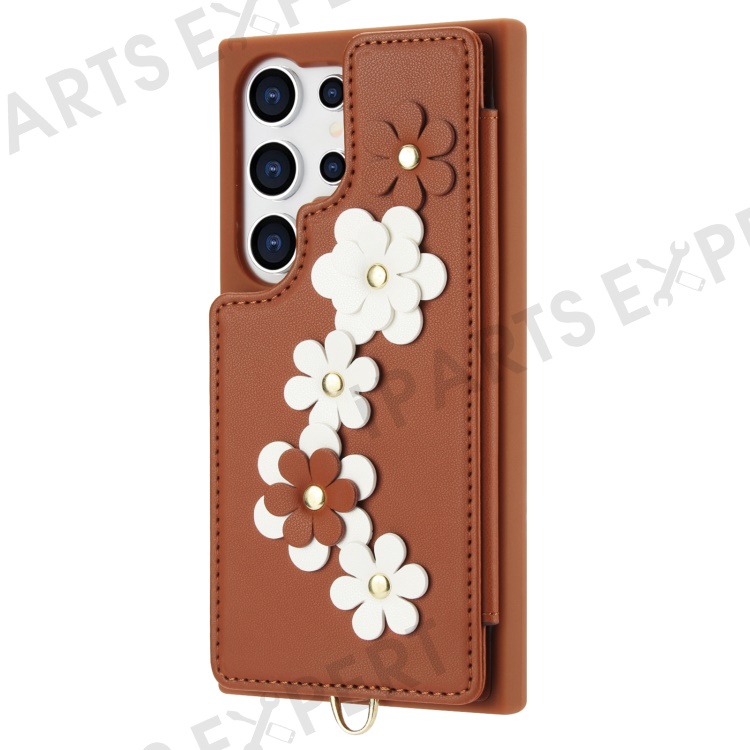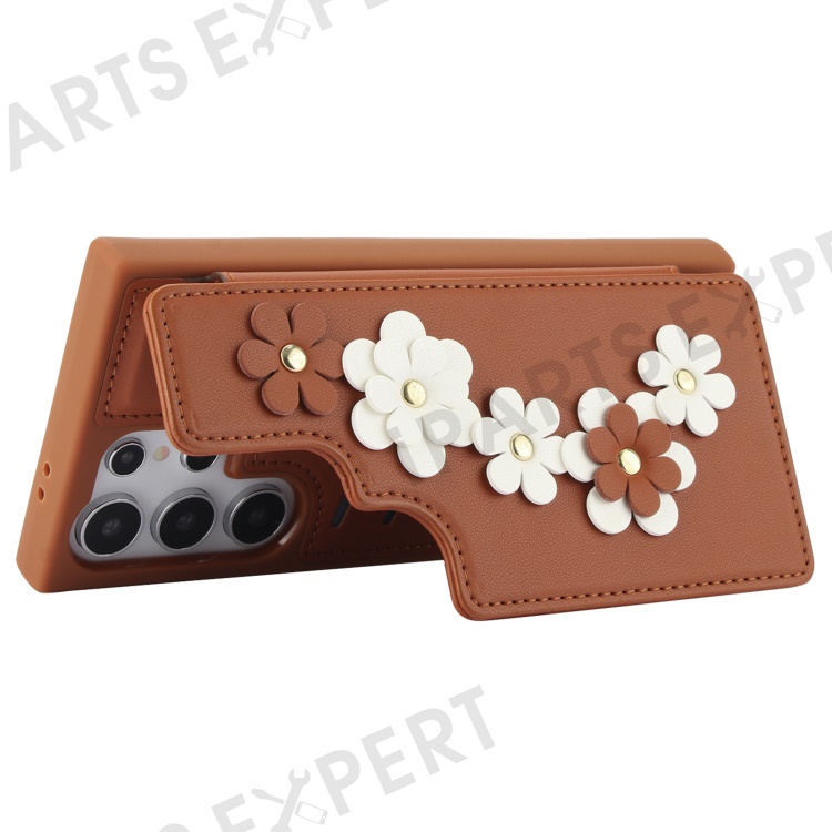 SY-001 For Samsung Galaxy S25 Ultra Case Card Slots Leather Coated TPU Flower Phone Cover - Brown
