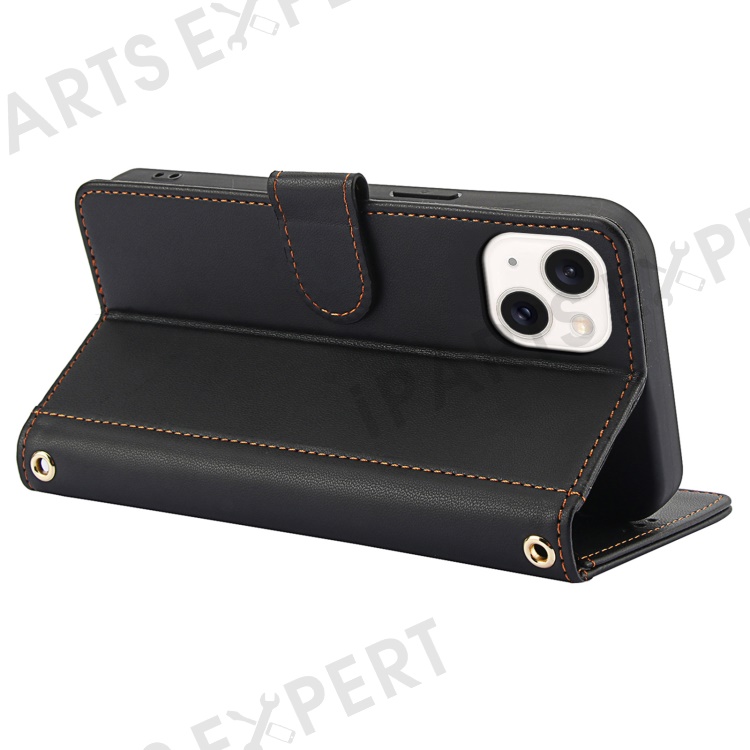 SY-003 For iPhone 15 Case PU Leather Stand View Phone Wallet Cover with Hand Strap - Black