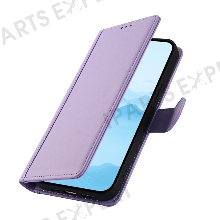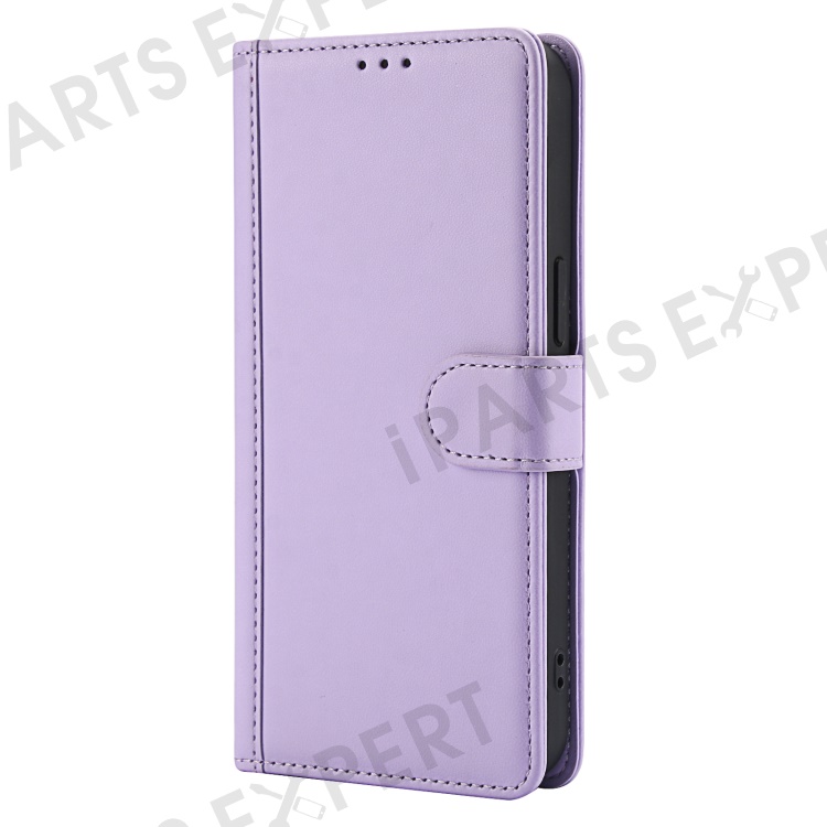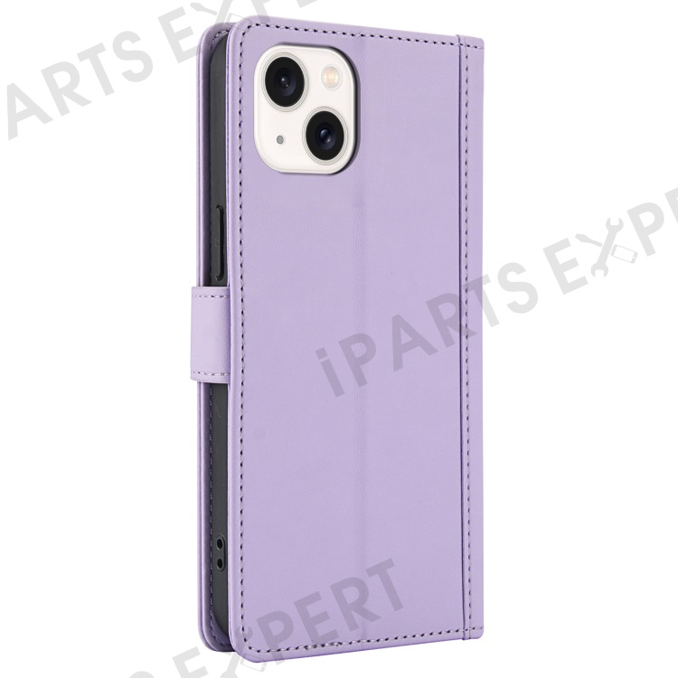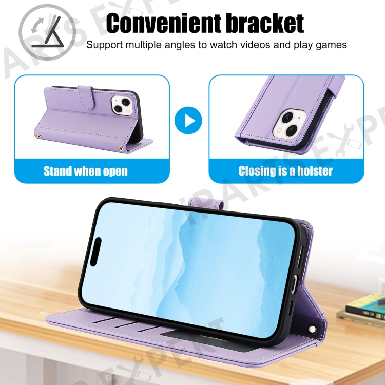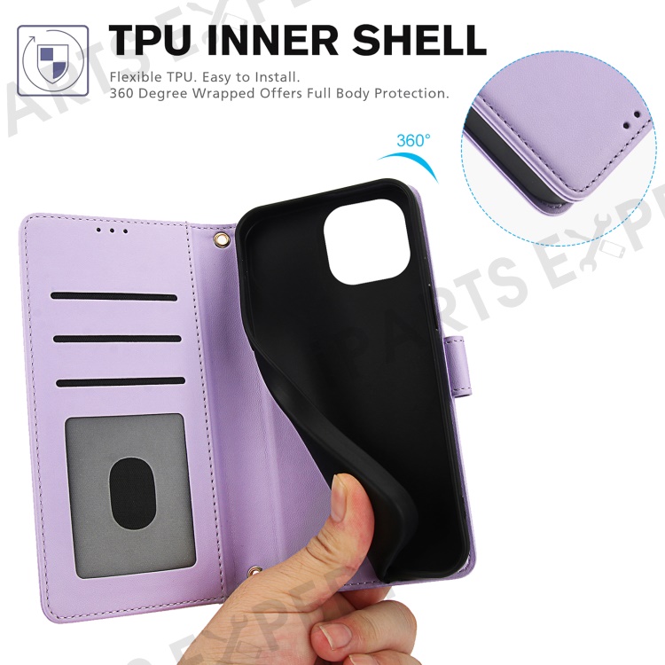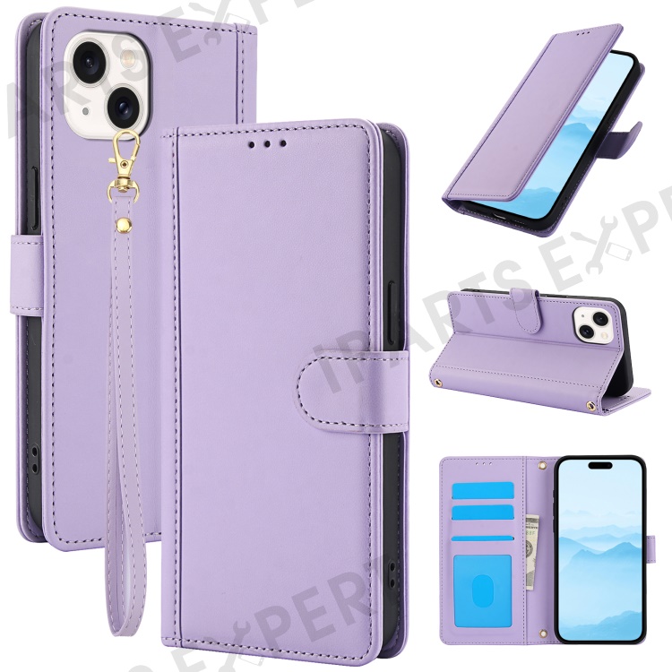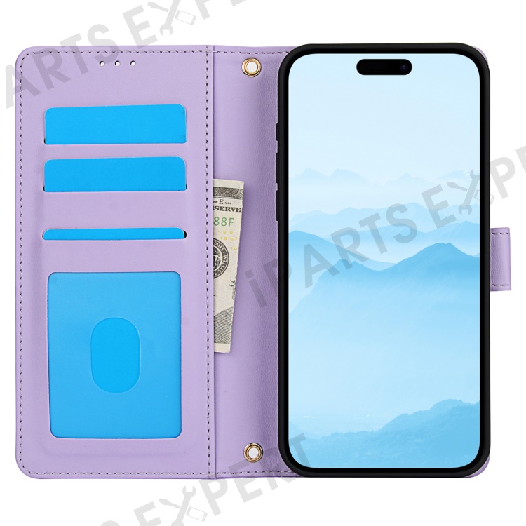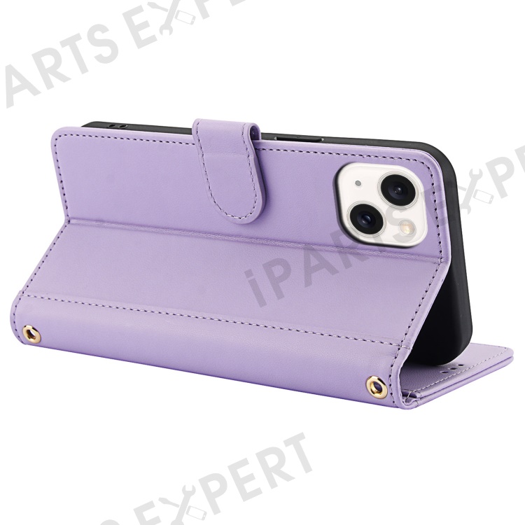 SY-003 For iPhone 15 Case PU Leather Stand View Phone Wallet Cover with Hand Strap - Purple