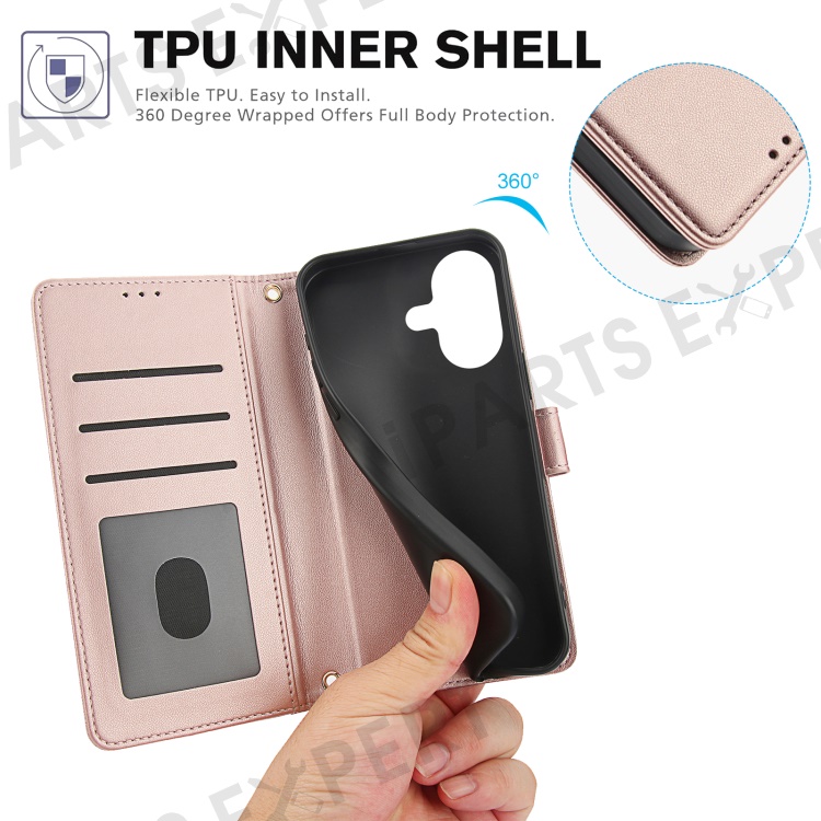 SY-003 For iPhone 16 Plus Case PU Leather Stand View Phone Wallet Cover with Hand Strap - Pink