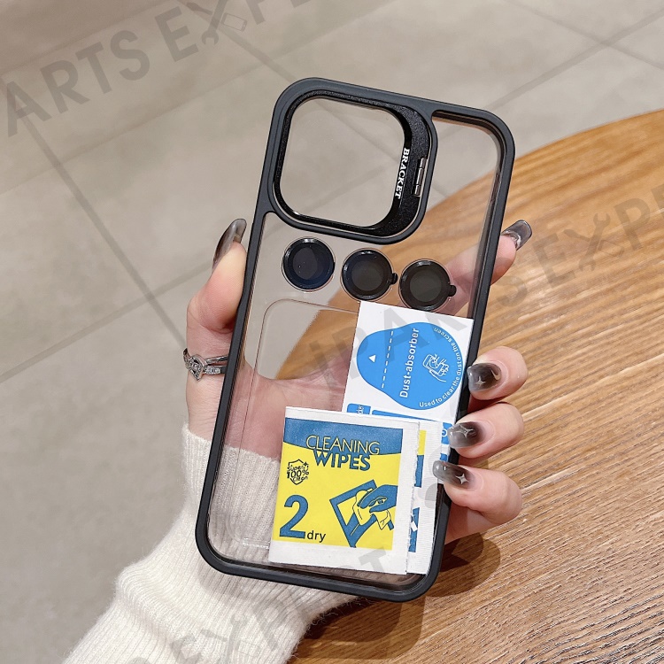 U1 For iPhone 15 Pro Case TPU+Acrylic Kickstand Phone Cover with Glass Lens Film - Black