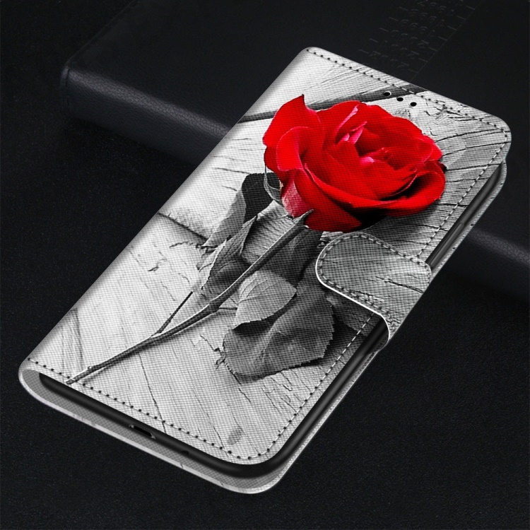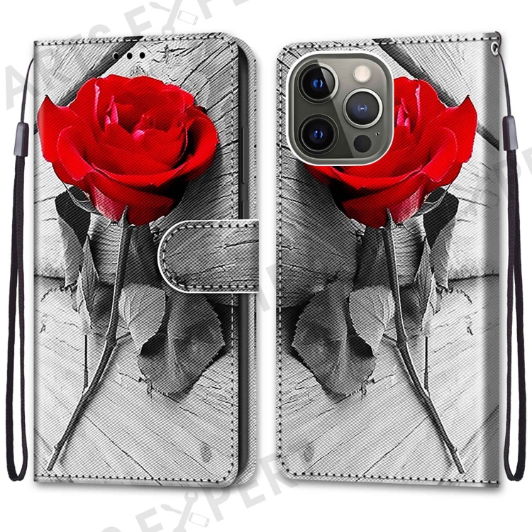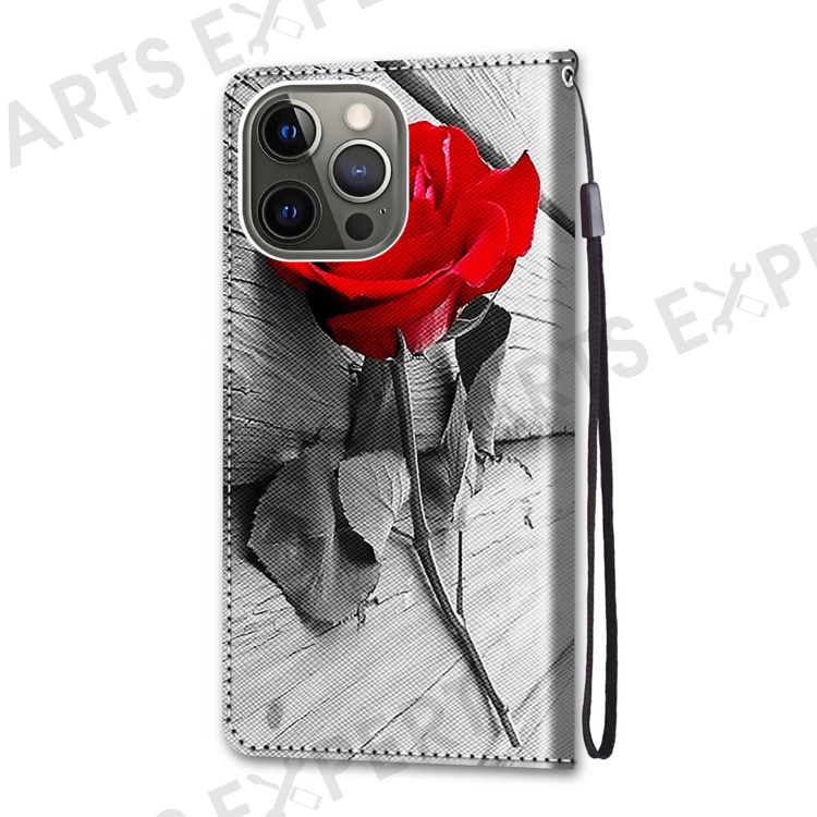 Unique Pattern Printing All-Inclusive Leather Cover Wallet Phone Case with Foldable Stand and Handy Strap for iPhone 13 Pro Max 6.7 inch - Red Rose