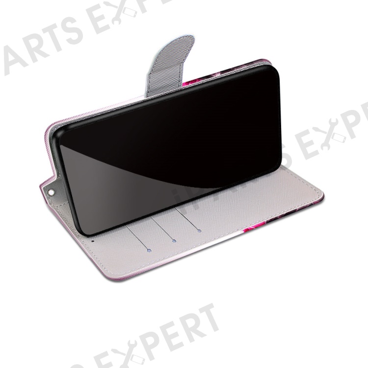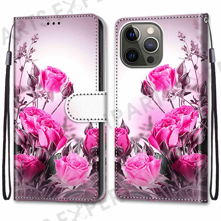 Wallet Design Pattern Printing Leather Cover Phone Case with Foldable Stand and Handy Strap for iPhone 13 Pro Max 6.7 inch - Wild Rose