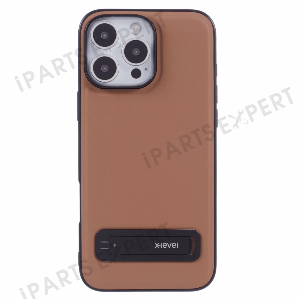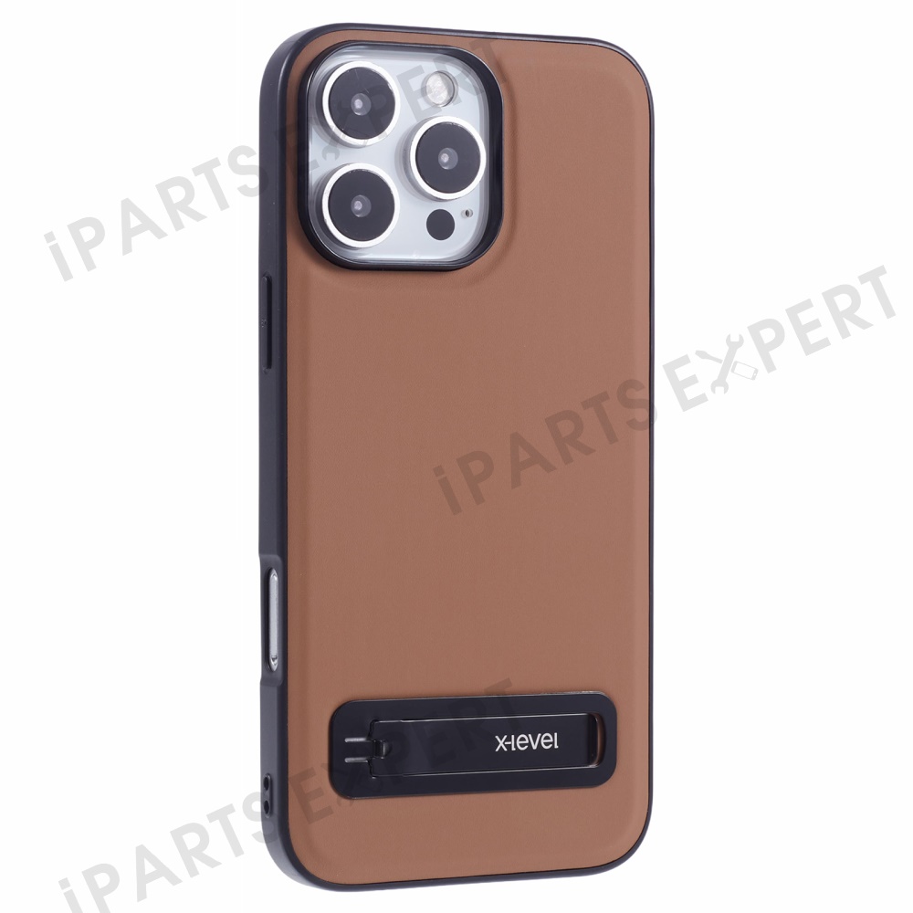 X-LEVEL For iPhone 16 Pro Max Phone Case Leather Coated PC TPU Back Cover with Metal Kickstand - Brown