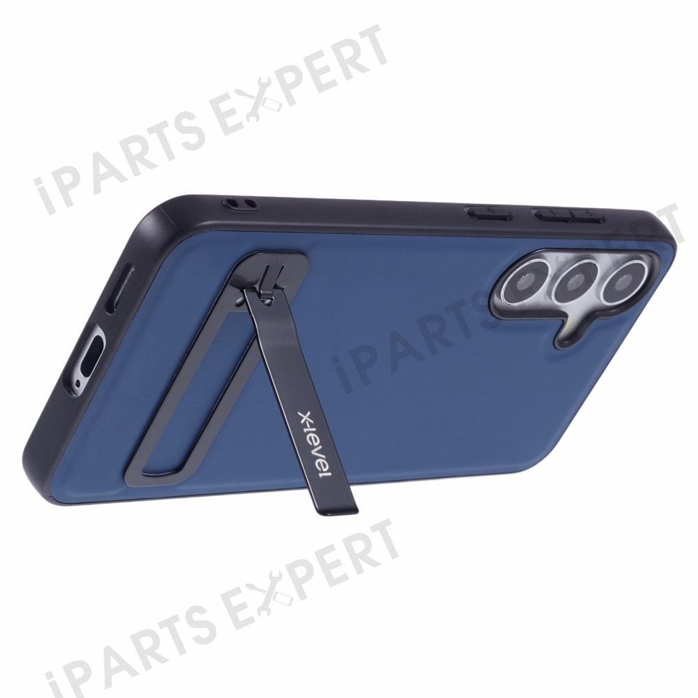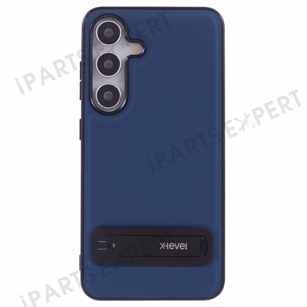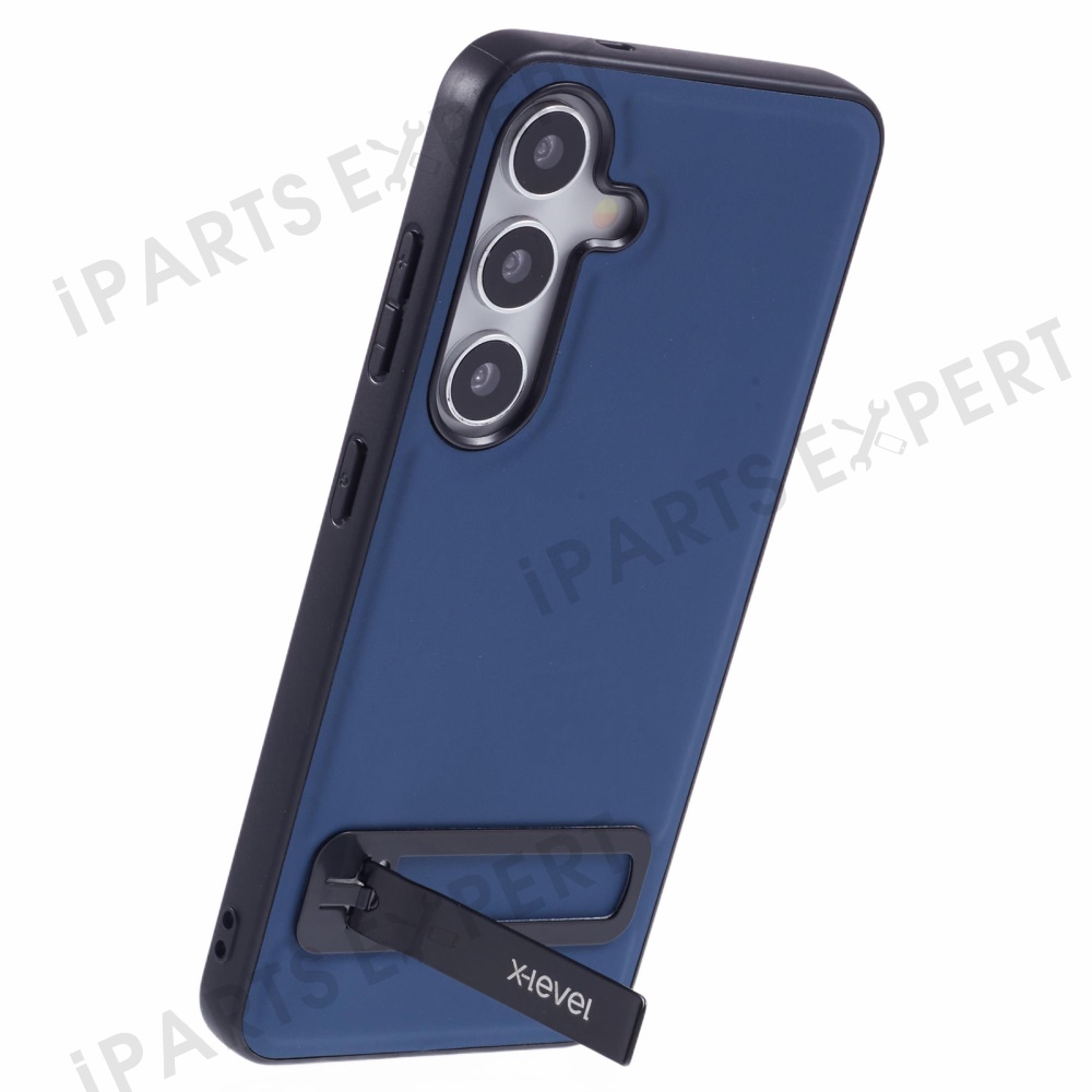 X-LEVEL For Samsung Galaxy S25 Phone Case Leather Coated PC TPU Back Cover with Metal Kickstand - Blue