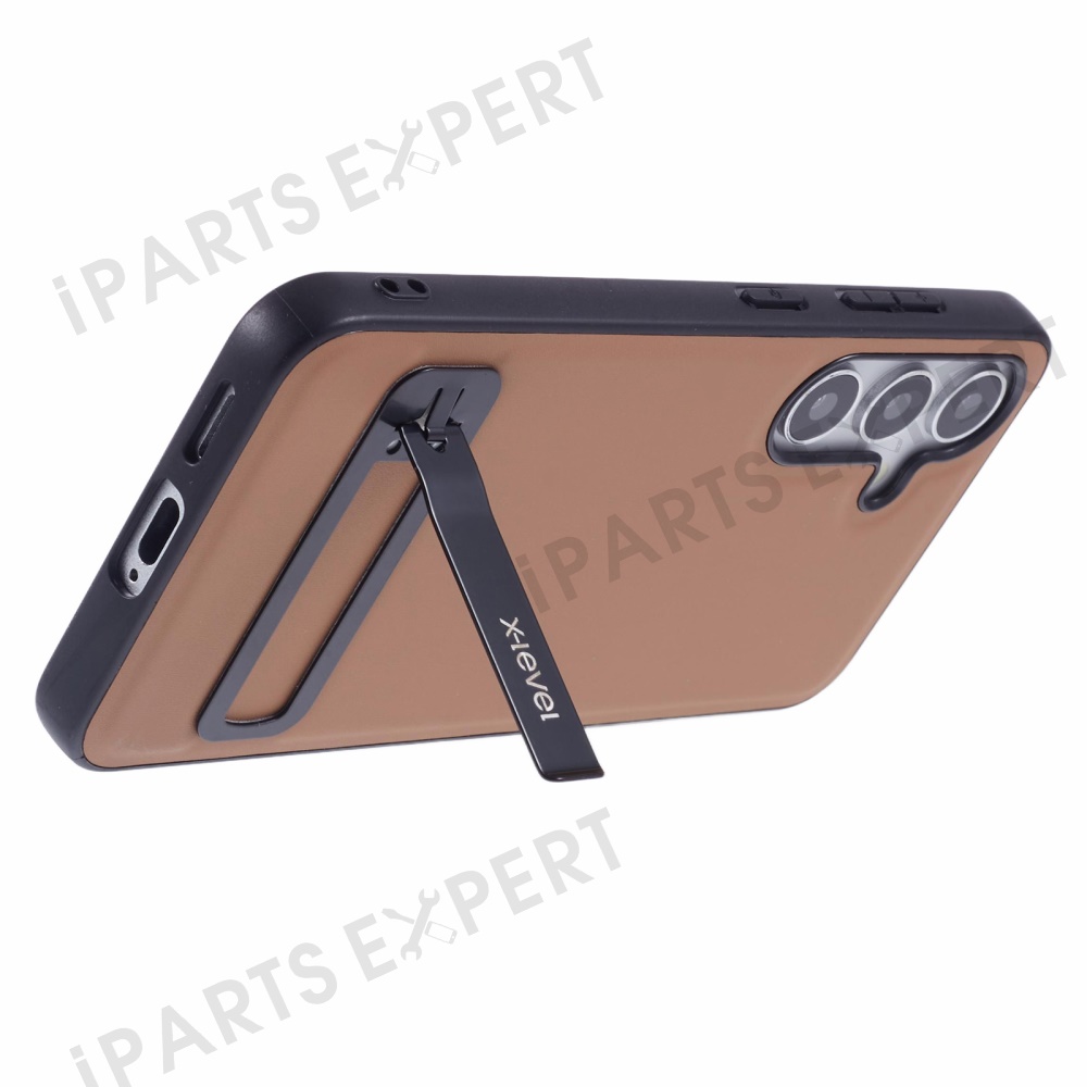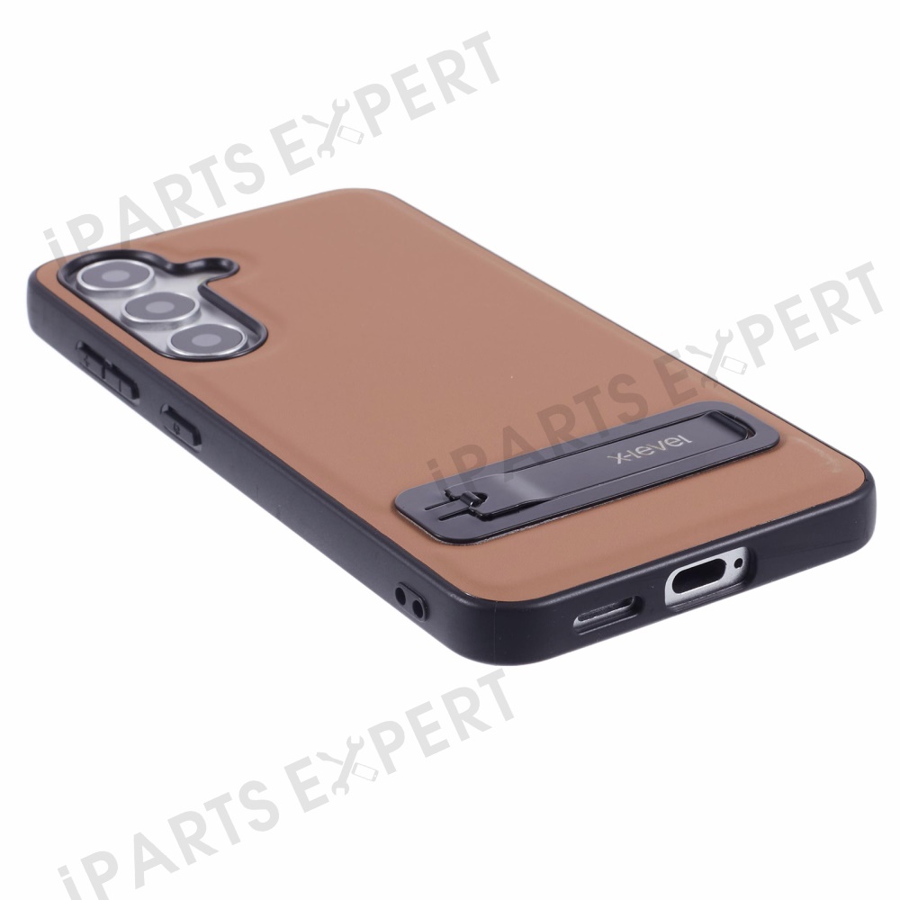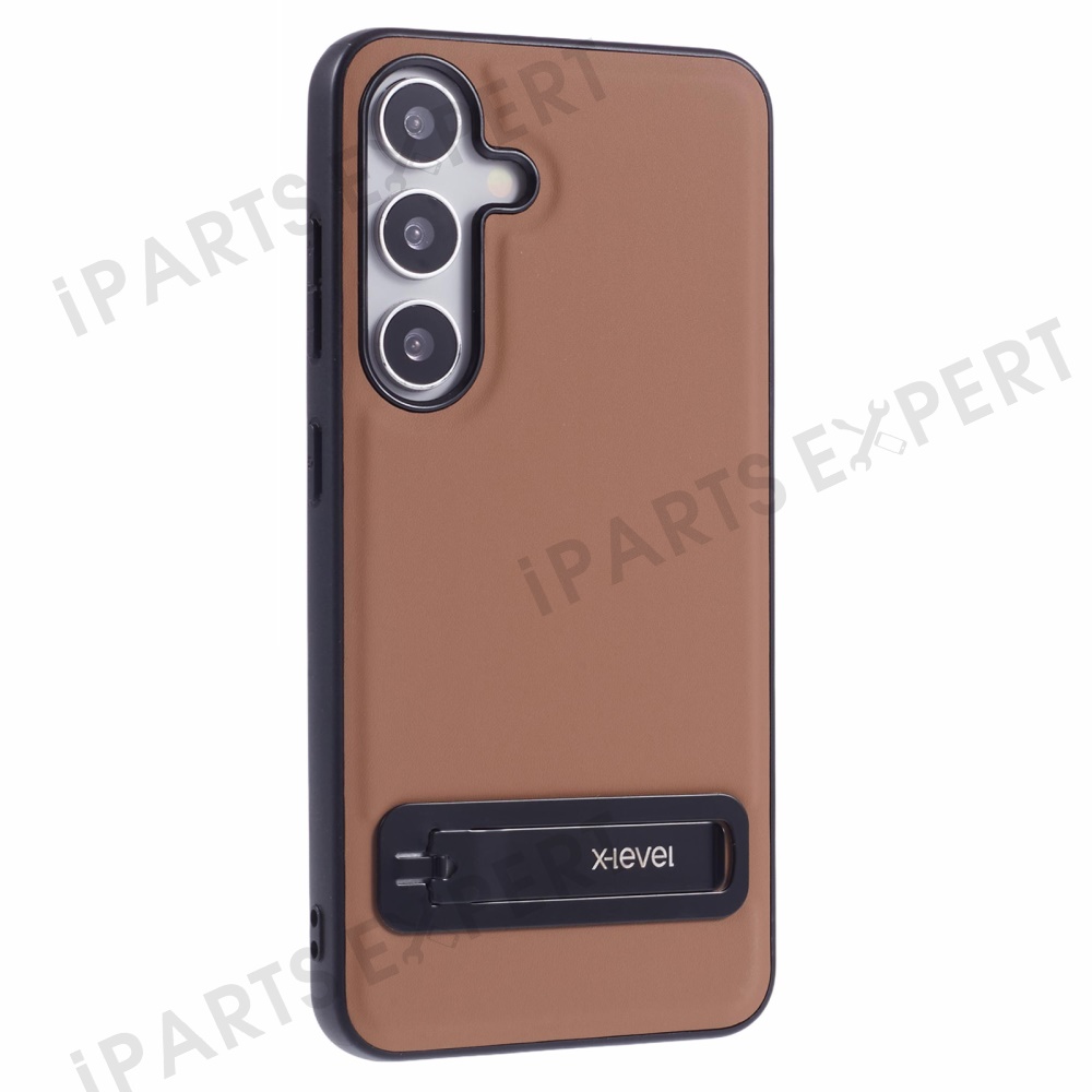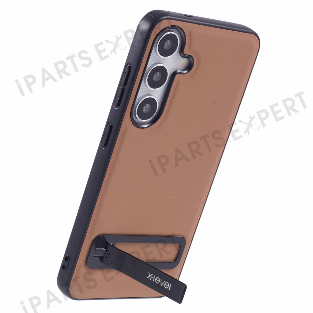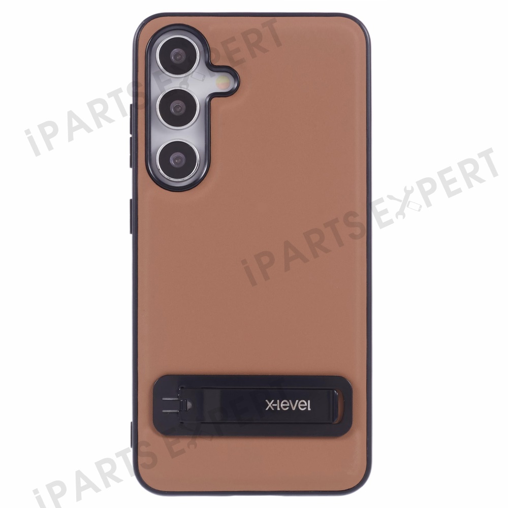 X-LEVEL For Samsung Galaxy S25 Phone Case Leather Coated PC TPU Back Cover with Metal Kickstand - Brown