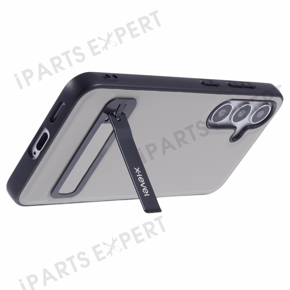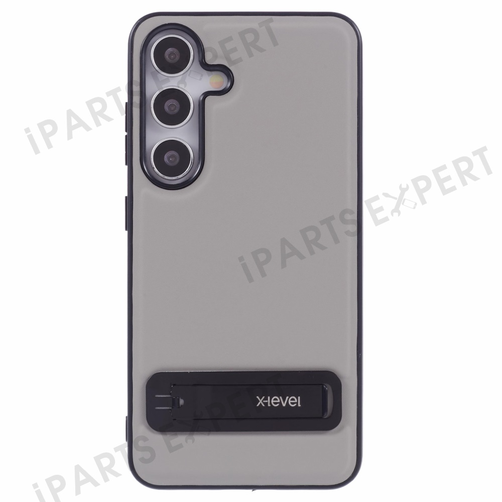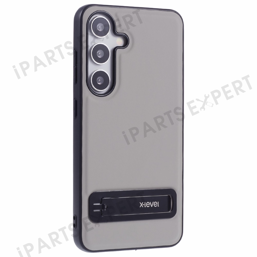 X-LEVEL For Samsung Galaxy S25 Phone Case Leather Coated PC TPU Back Cover with Metal Kickstand - Grey