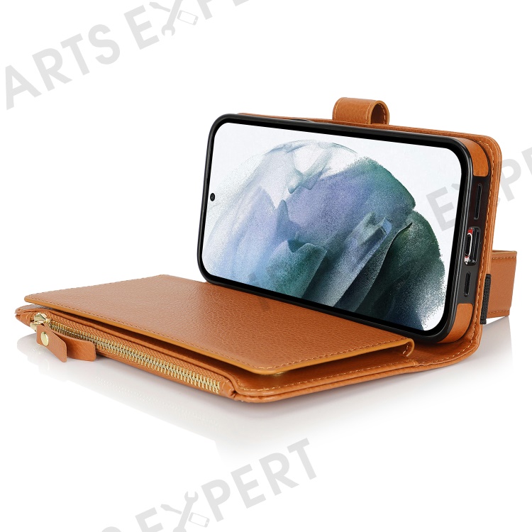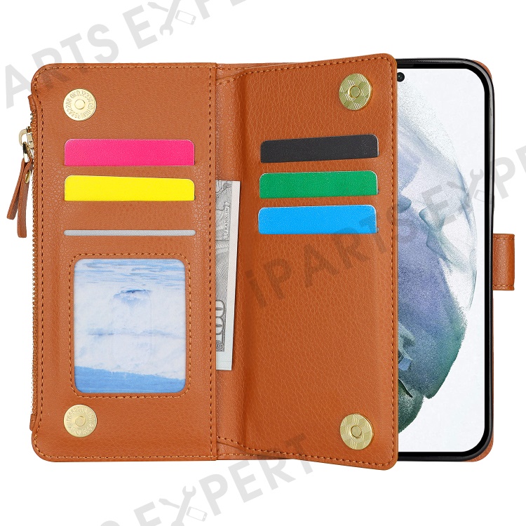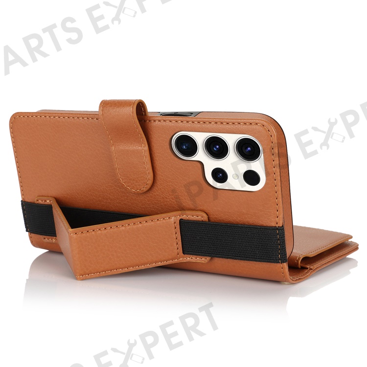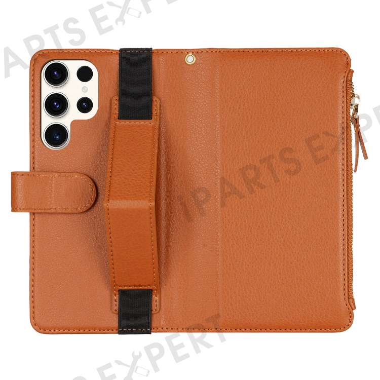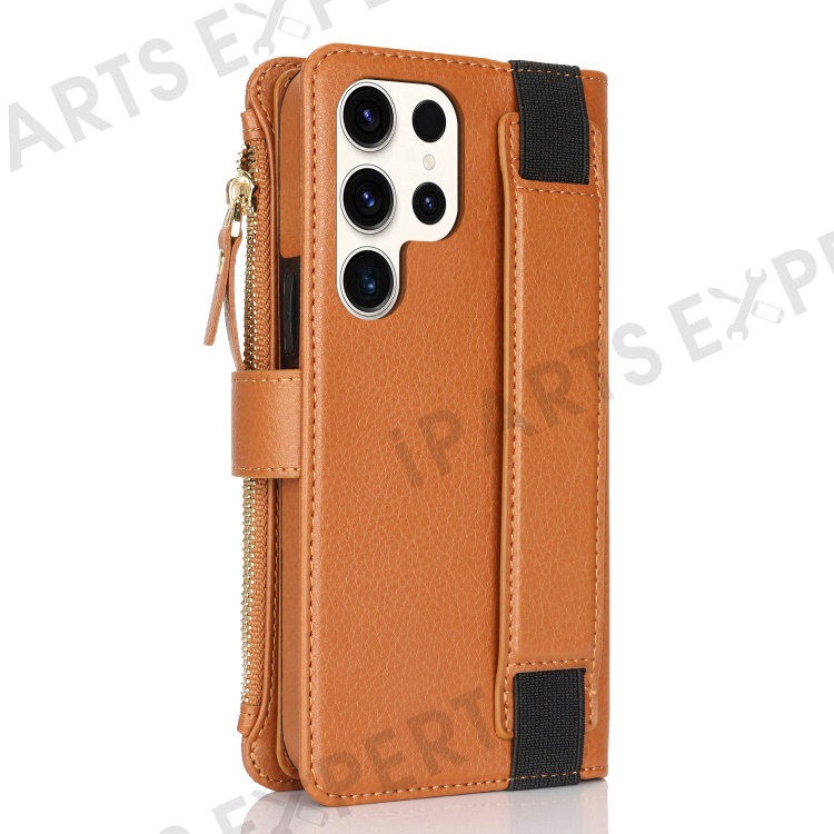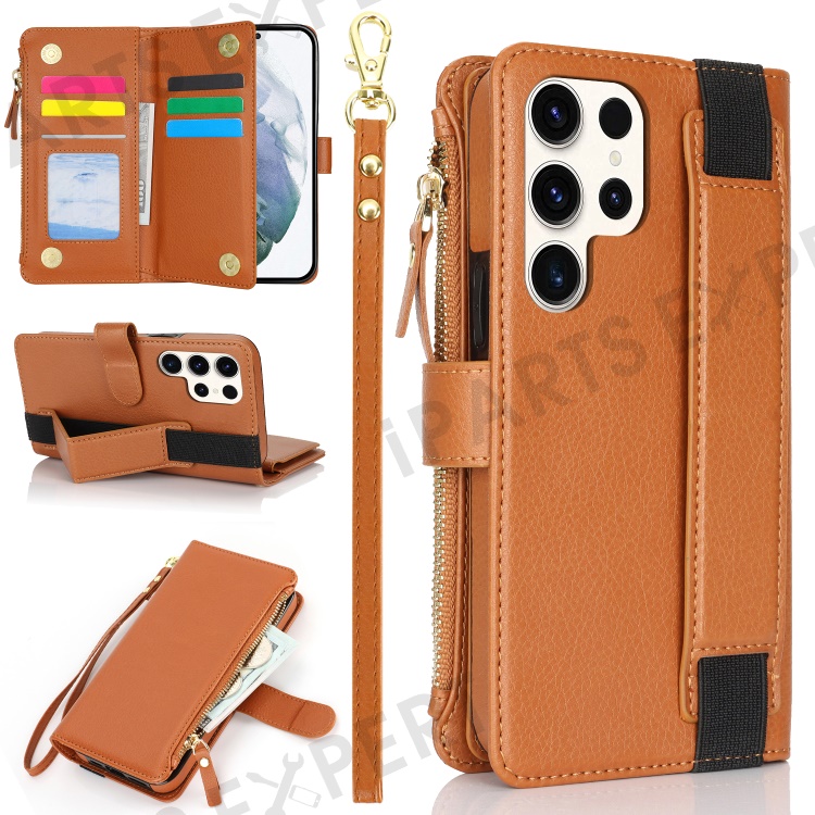 XL-001 For Samsung Galaxy S23 Ultra Case Zipper Pocket Wristband Stand Leather Phone Cover - Brown
