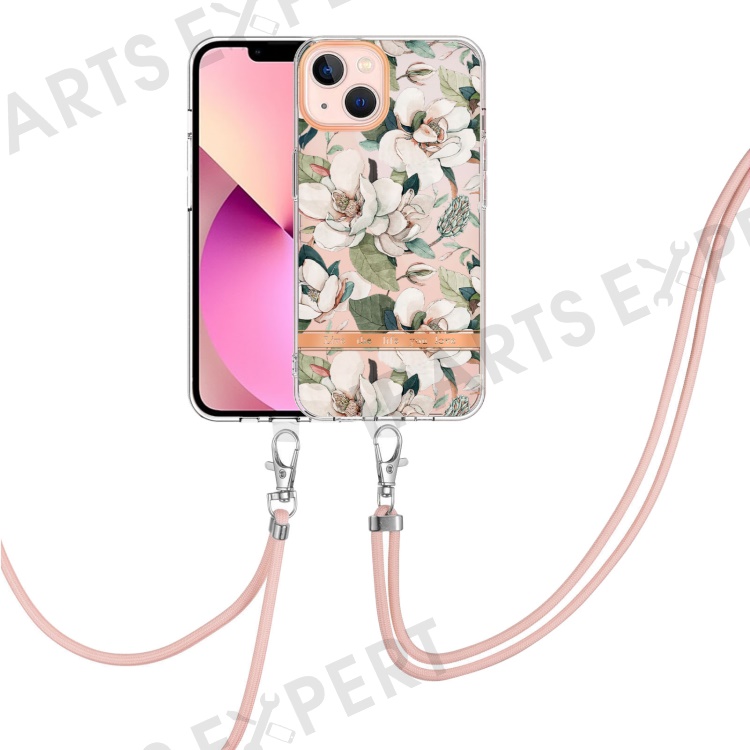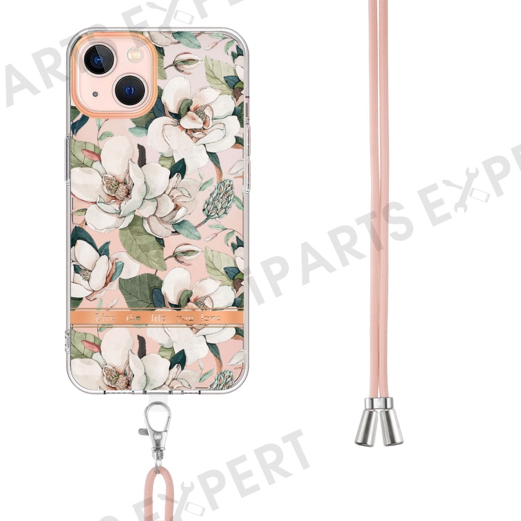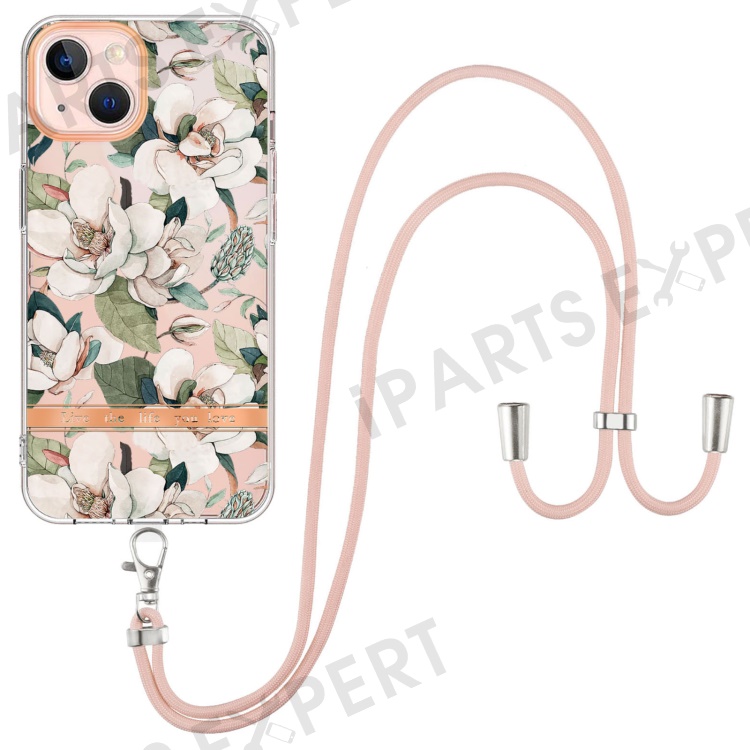 For iPhone 15 Plus Back Cover with Shoulder Strap Flower Pattern Electroplating TPU Case - HC001 Green Gardenia