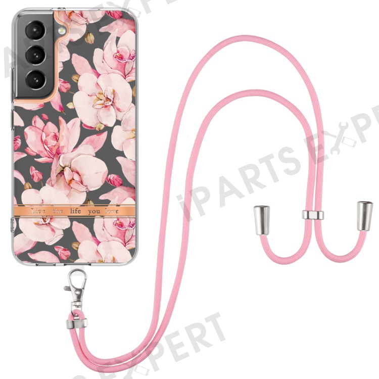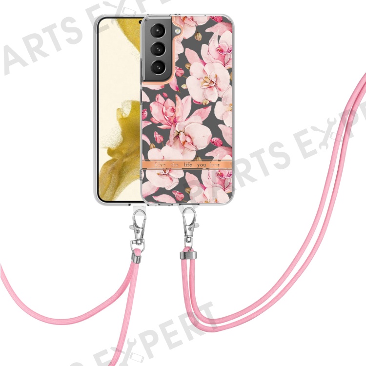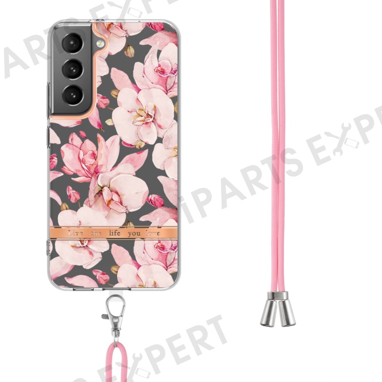 YB IMD-11 Series for Samsung Galaxy S23+ Flower Pattern IMD IML Electroplating TPU Case Anti-scratch Anti-drop Phone Back Cover with Lanyard - HC005 Pink Gardenia