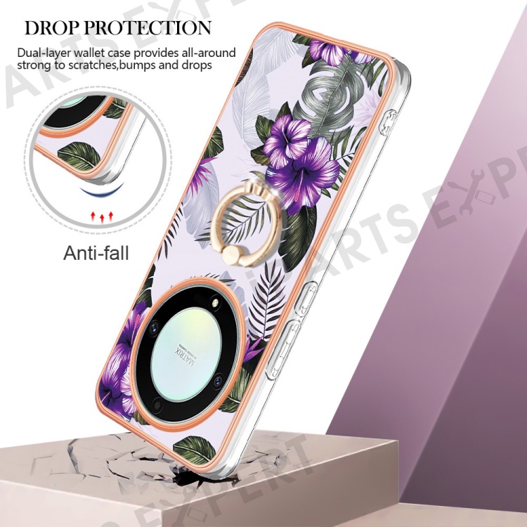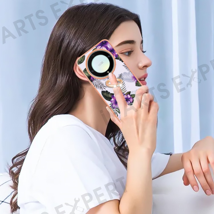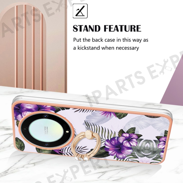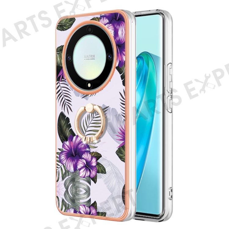 For Honor X9a 5G / Magic5 Lite 5G Case with Ring Kickstand IMD Marble Pattern TPU Back Cover - Purple Flowers