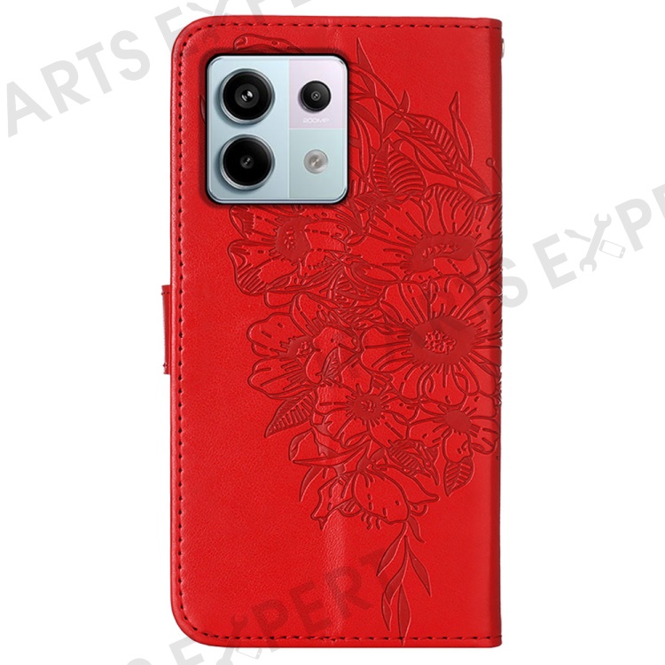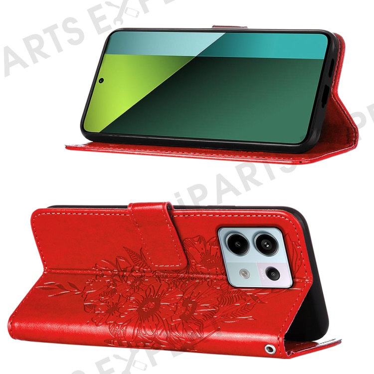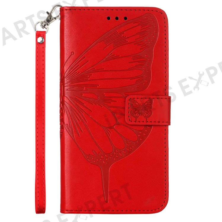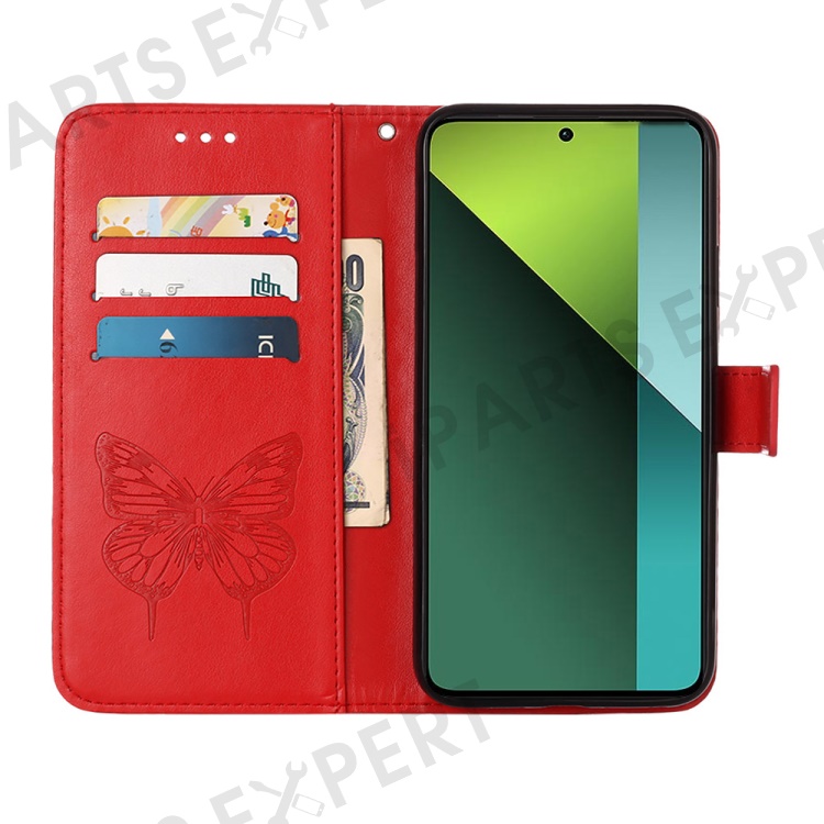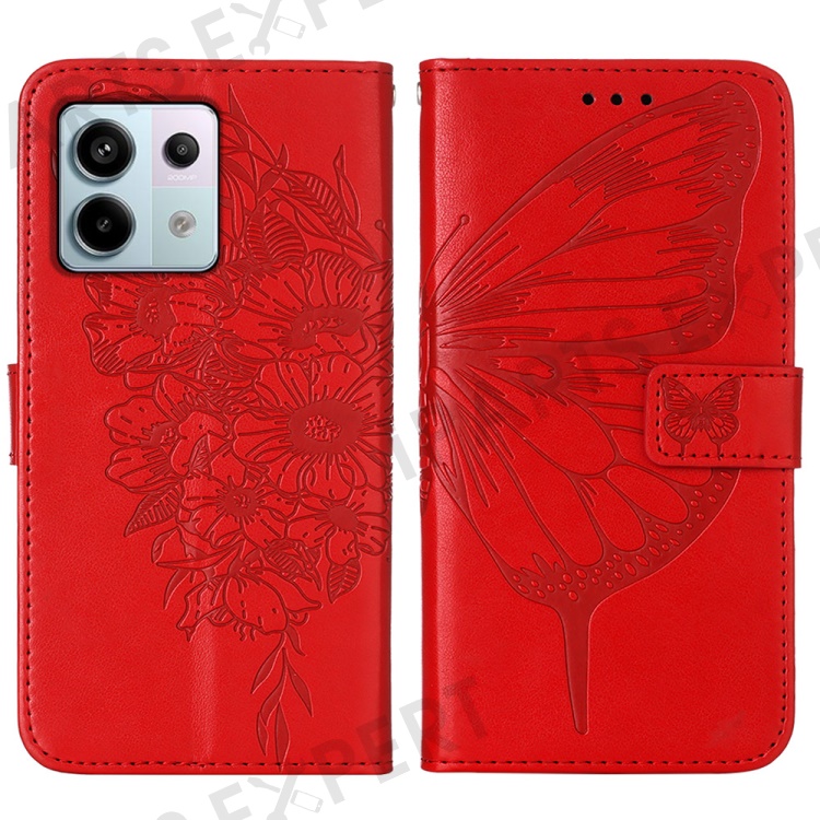 For Xiaomi Redmi Note 13 Pro 5G / Poco X6 5G Wallet Case with Wrist Strap Butterfly Imprint Leather Phone Cover - Red