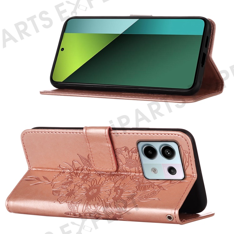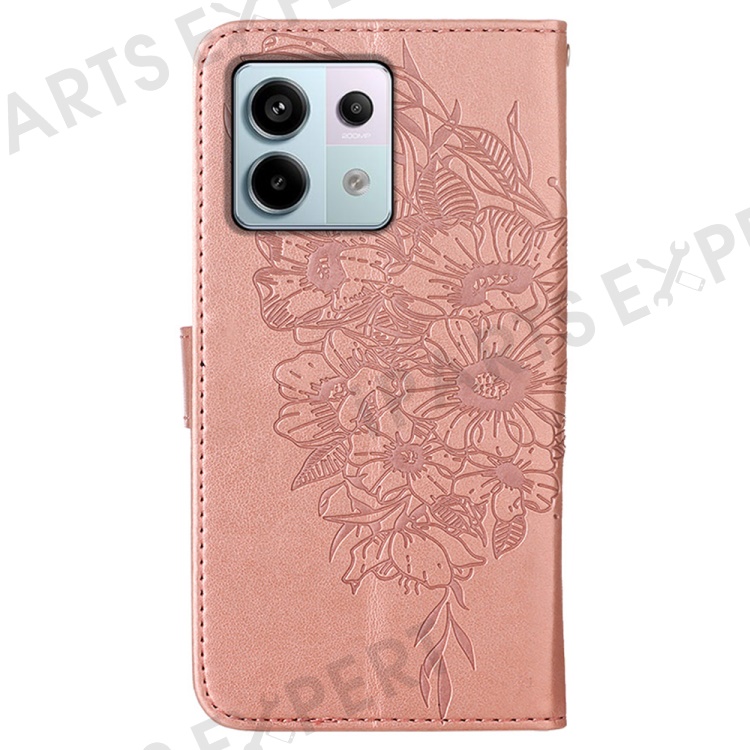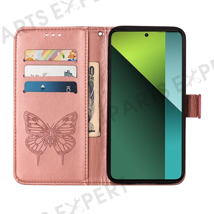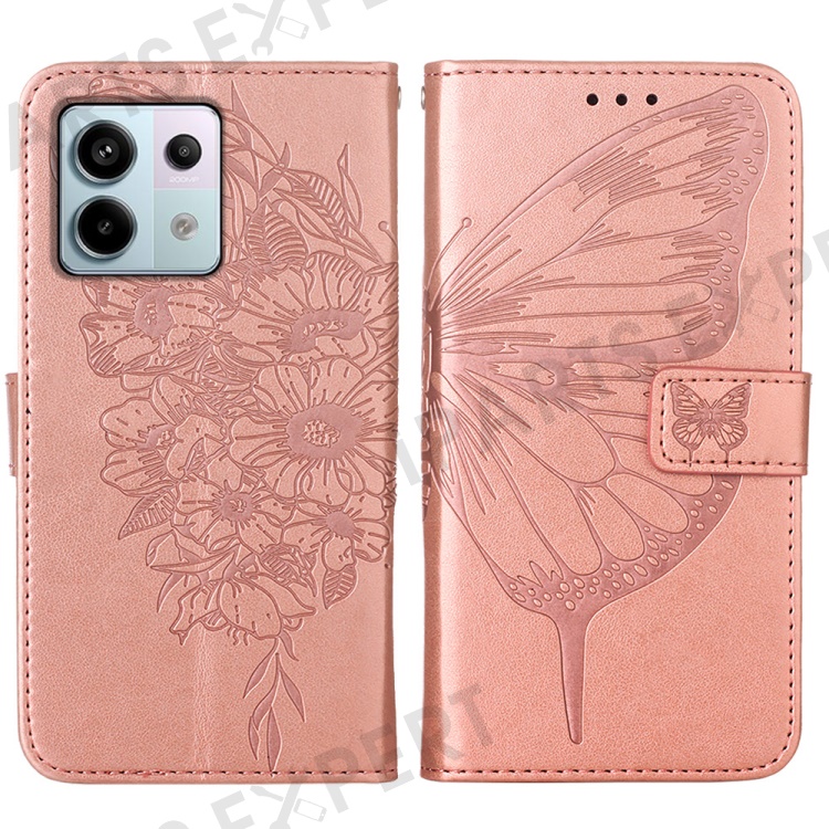 For Xiaomi Redmi Note 13 Pro 5G / Poco X6 5G Wallet Case with Wrist Strap Butterfly Imprint Leather Phone Cover - Rose Gold