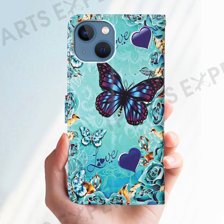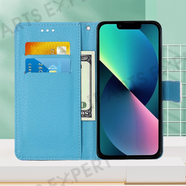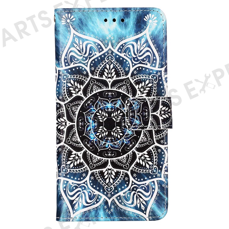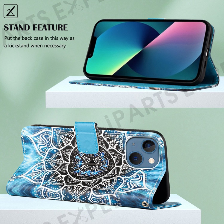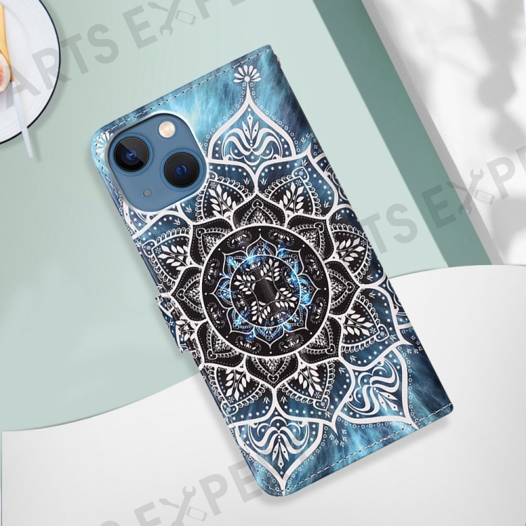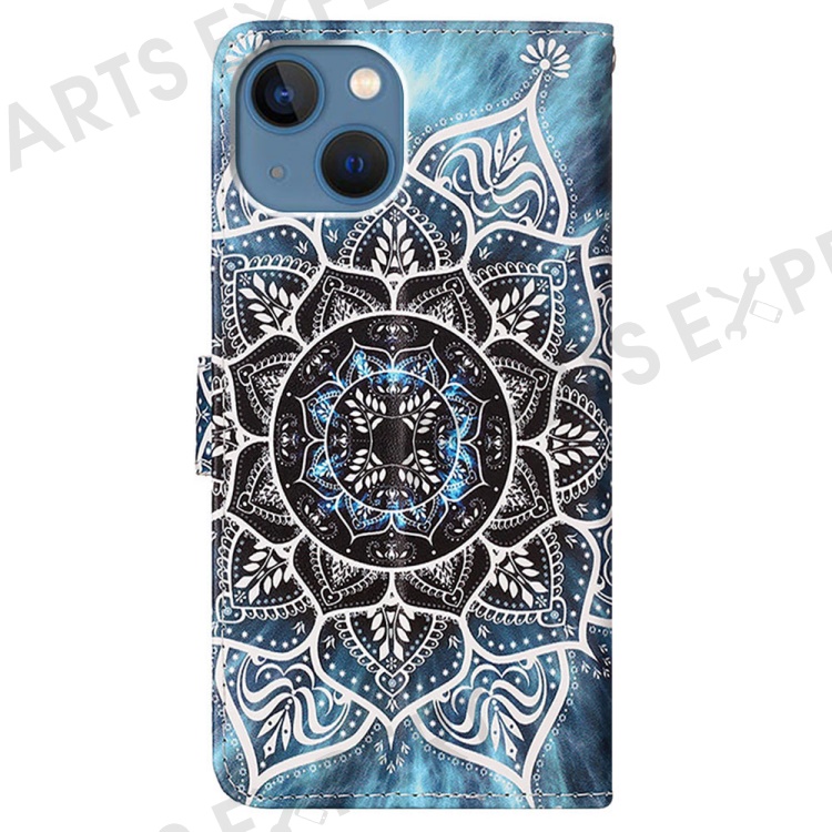 For iPhone 14 Leather Case with Strap and Card Holder Pattern Printing Phone Stand Cover - Mandala Flower
