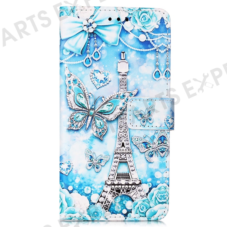 For Samsung Galaxy A54 5G Leather Case with Strap and Card Holder Pattern Printing Phone Stand Cover - Eiffel Tower and Butterfly