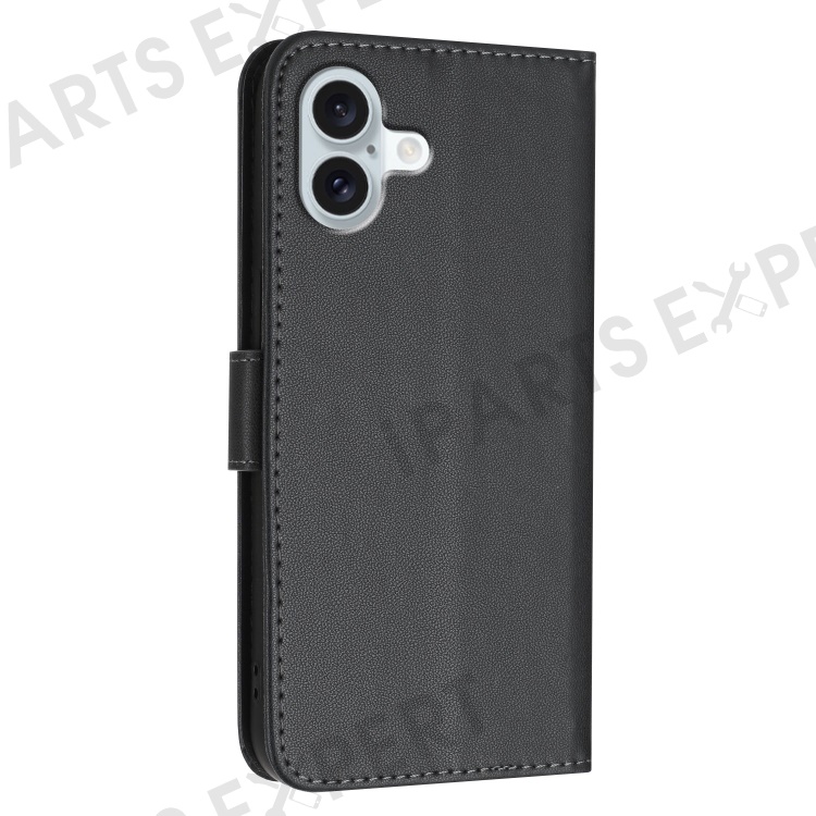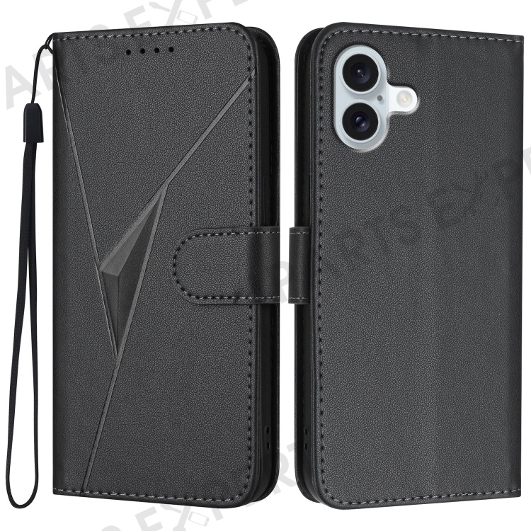 YX0090 For iPhone 16 Plus Case Triangle Imprint Leather Phone Cover with Lanyard - Black