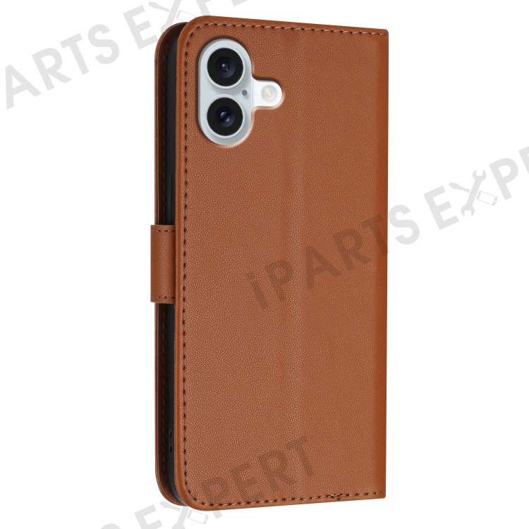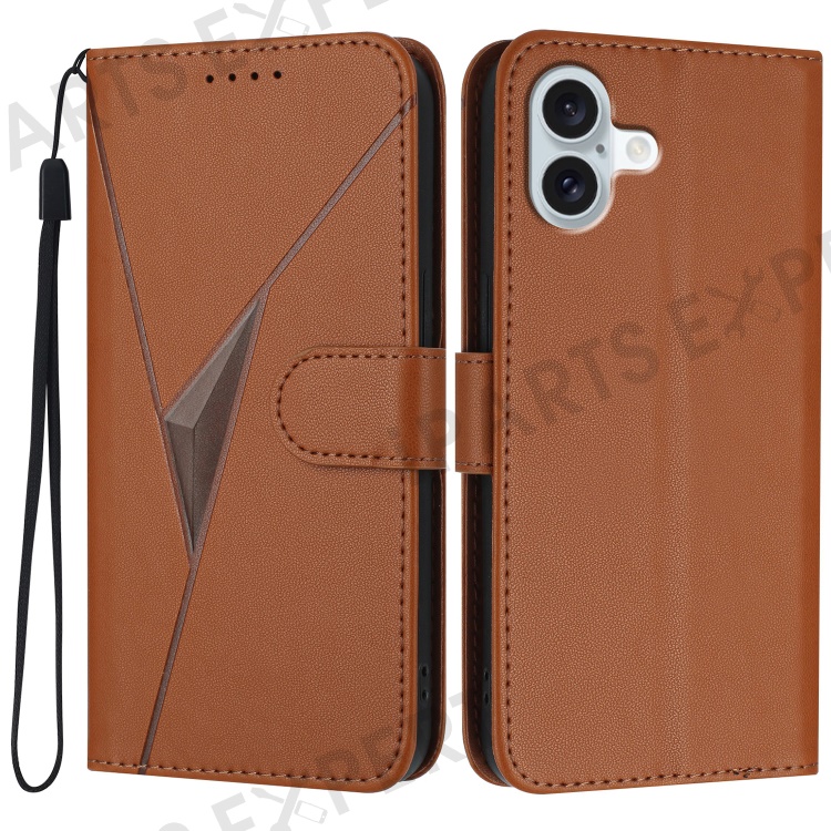 YX0090 For iPhone 16 Plus Case Triangle Imprint Leather Phone Cover with Lanyard - Coffee