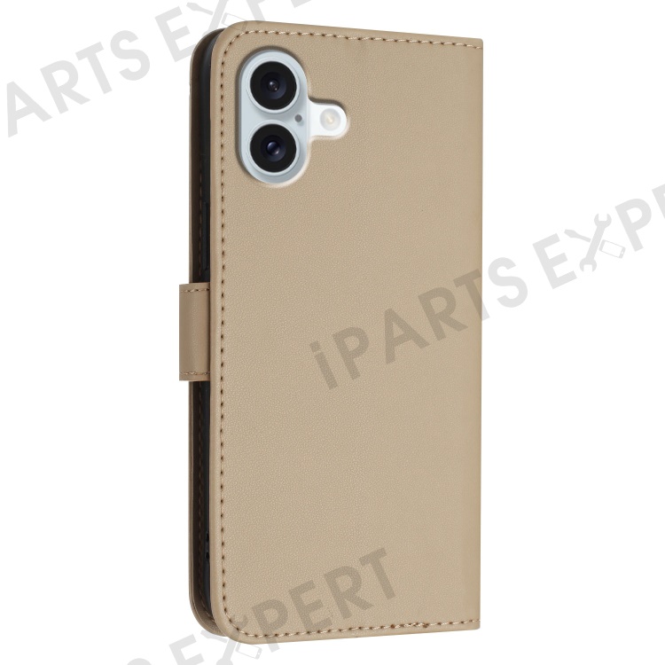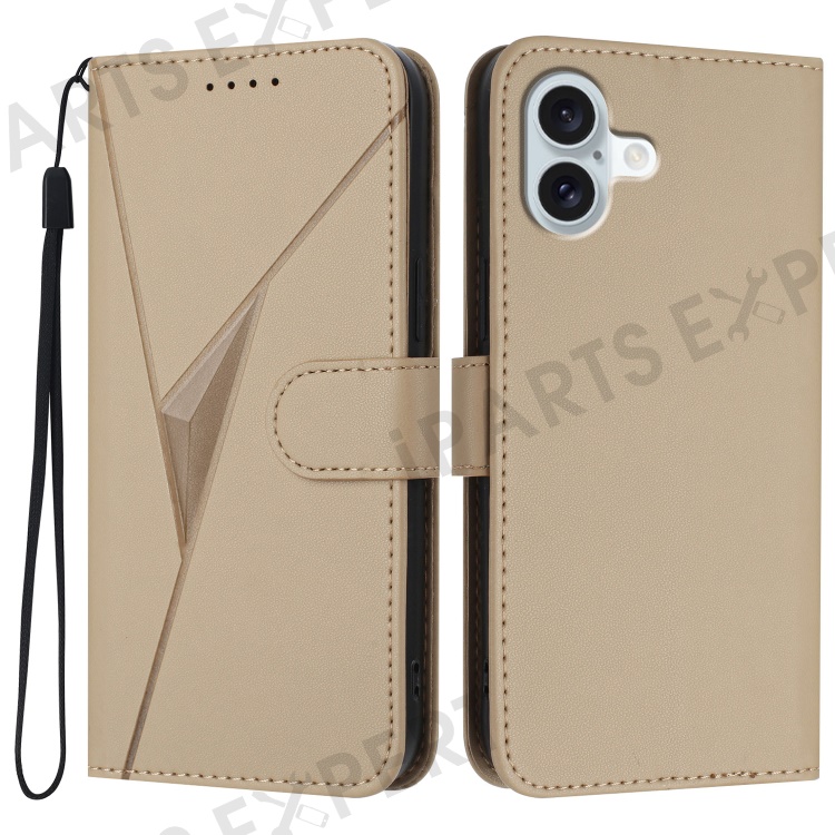 YX0090 For iPhone 16 Plus Case Triangle Imprint Leather Phone Cover with Lanyard - Gold