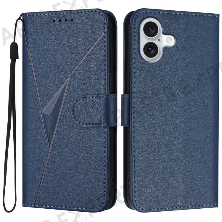 YX0090 For iPhone 16 Plus Case Triangle Imprint Leather Phone Cover with Lanyard - Sapphire