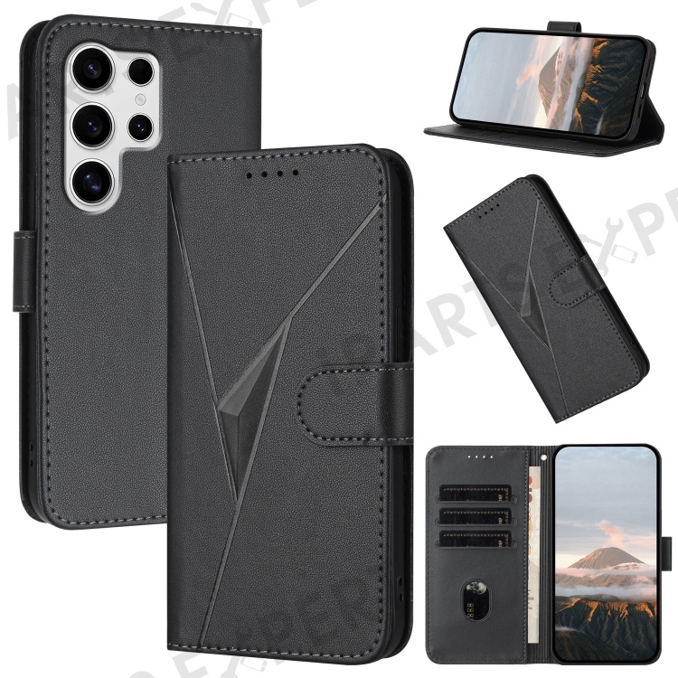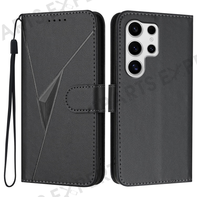 YX0090 For Samsung Galaxy S25 Ultra Case Triangle Imprint Leather Phone Cover with Lanyard - Black