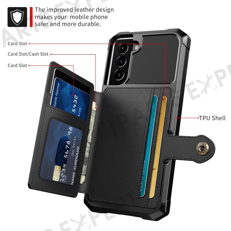 ZM03 Anti-fingerprint Card Holders Kickstand PU Leather + TPU Hybrid Case Phone Shell [Built-in Magnetic Metal Sheet] for Samsung Galaxy S22+ 5G - Black